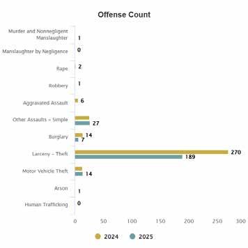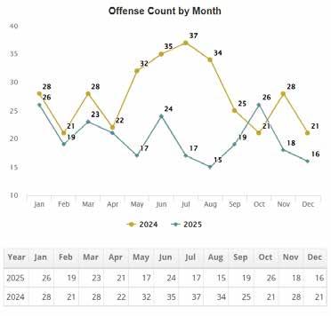 Theft is the crime of the highest rate, though it decreased by 30% from 2024 to 2025. Crime takes place at a generally higher rate in spring to summer months. Though not necessarily correlative, those are also peak months for park and trail usage, according to consistent observation by the Township.