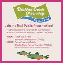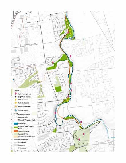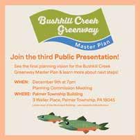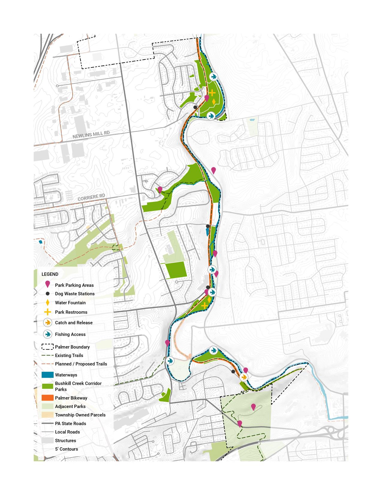 The Bushkill Creek Greenway Master Plan unites various trails and public spaces as a cohesive greenway experience. A community-driven vision for a more sustainable future, this plan imagines the Creek as a place for people and nature. Introducing accessibility upgrades for parks and trails (some of which were built well before the 1990 Americans With Disabilities Act) will bring a new era of inclusive public space to Palmer Township. The plan also embraces a community mandate for improvements to ecological and hydrological systems that can protect the Bushkill Creek from the expected impacts of climate change.