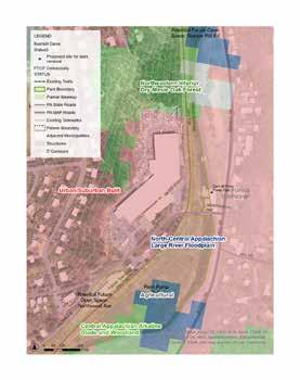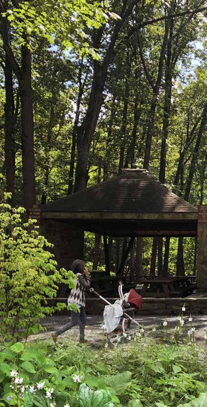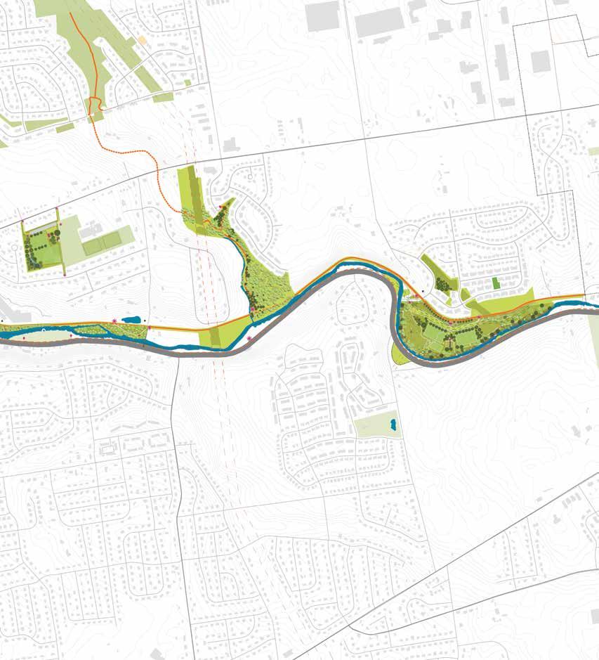 • Preserving the peaceful setting of the Bushkill for respite while also establishing spaces for community gathering, all at a scale that is appropriate to the Greenway