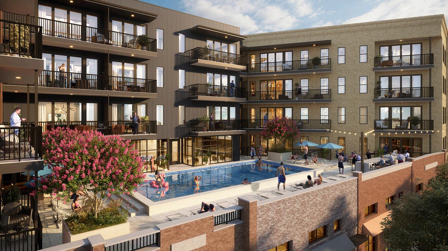 Located in the Deep Ellum District in Dallas, Texas, this 7-level podium project has 190 units. The building is reflective of the Historic Deep Ellum character, but executed in a more contemporary architectural style. Amenities include co-working space, a coffee bar and an elevated pool deck.