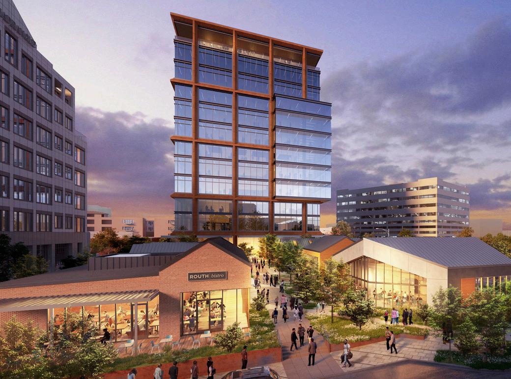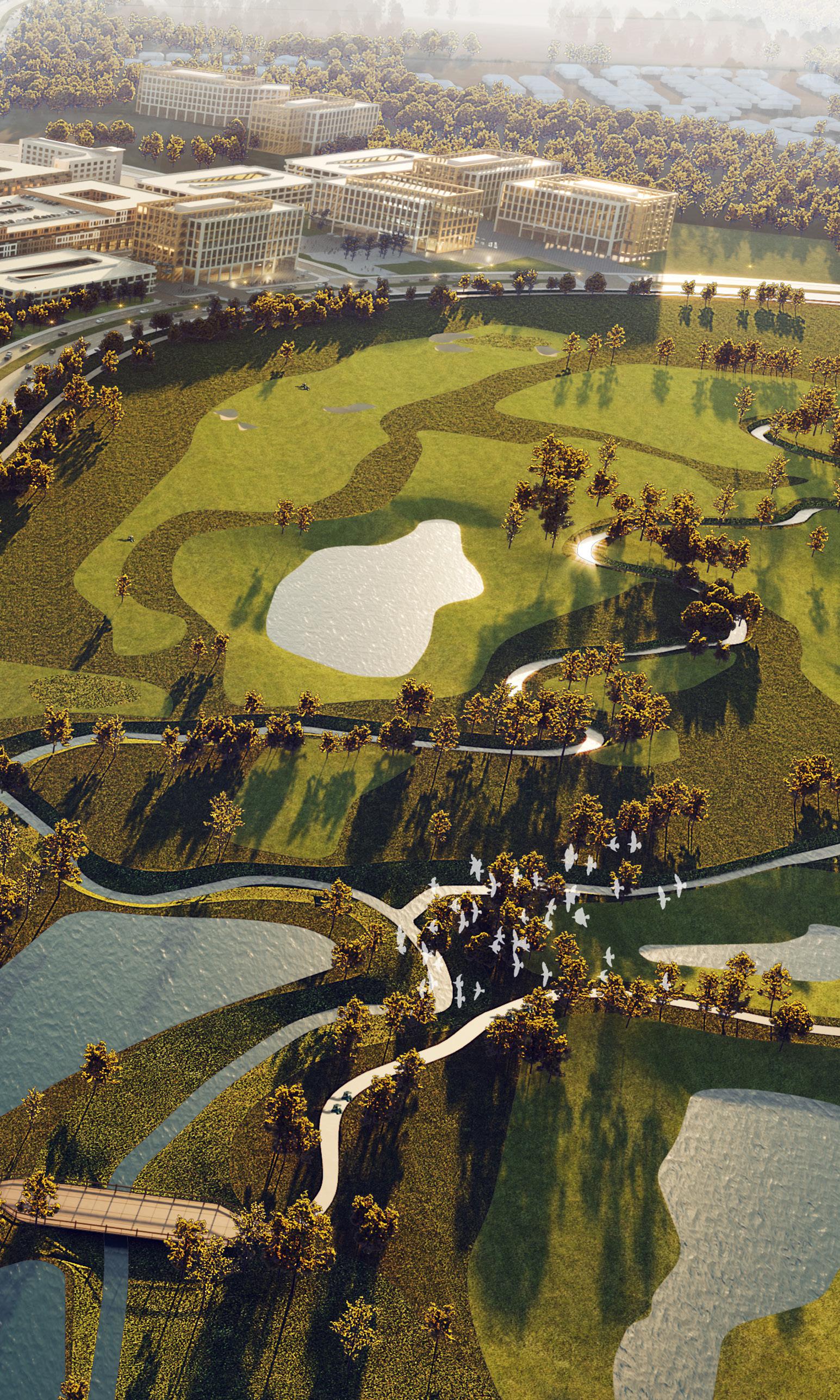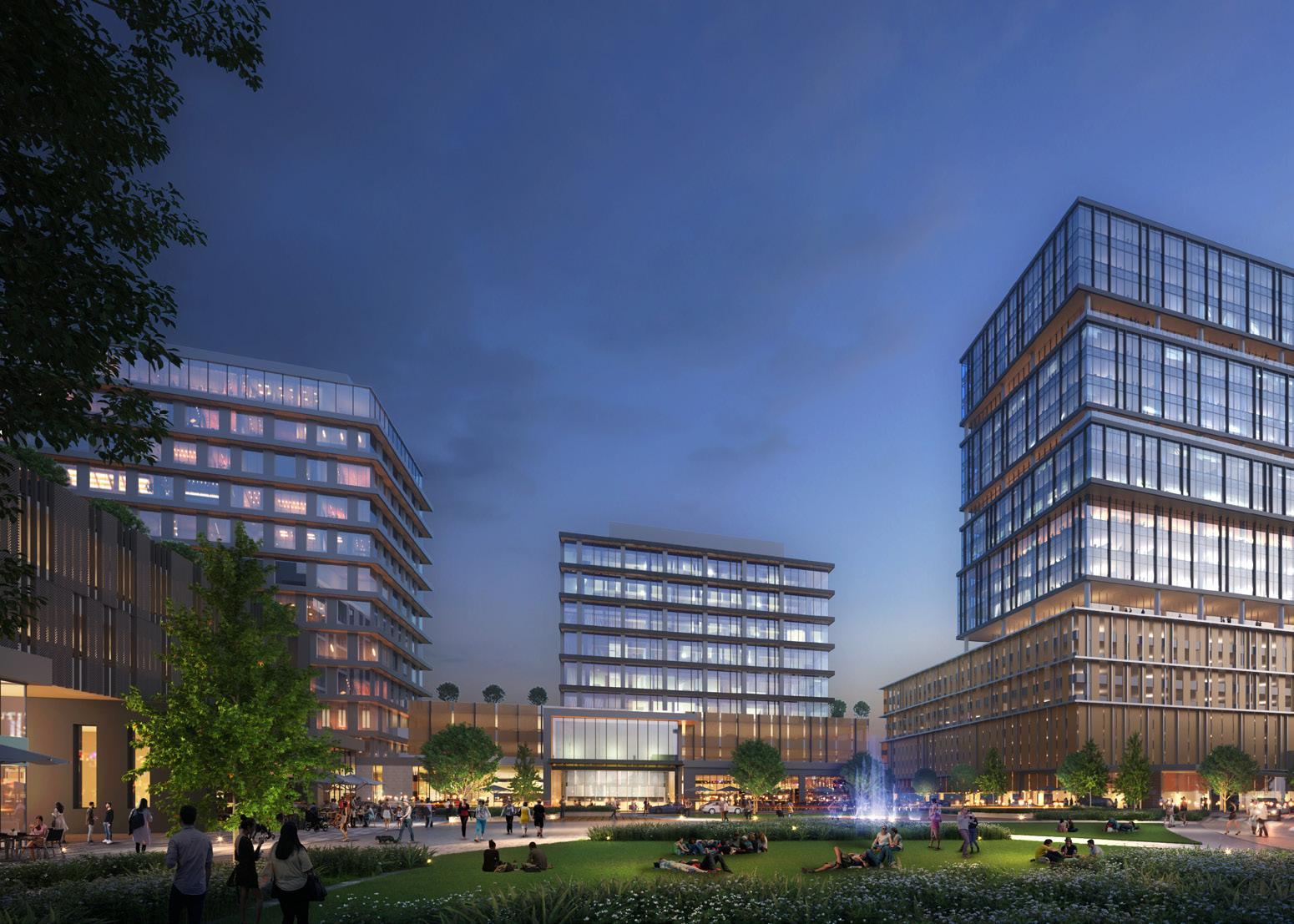The 22-acre mixed-use development is focused around a central park that connects the various use buildings together all while catering to the pedestrian environment.