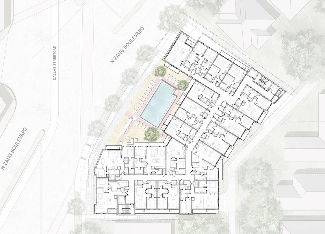 Located in Deep Ellum at the intersection of Malcolm X and Taylor, this is a podium multifamily project with 177,599 NRSF. The design includes 192 units total with a mix of studio, one and two bedroom layouts. Three levels of parking, including one below grade, provide 209 parking spaces. There is also 13,000 SF of amenity/ leasing space and a 7,600 SF outdoor pool and amenity deck on the third floor. The facade’s bold grid pattern creates an industrial feeling in keeping with the surrounding neighborhood.