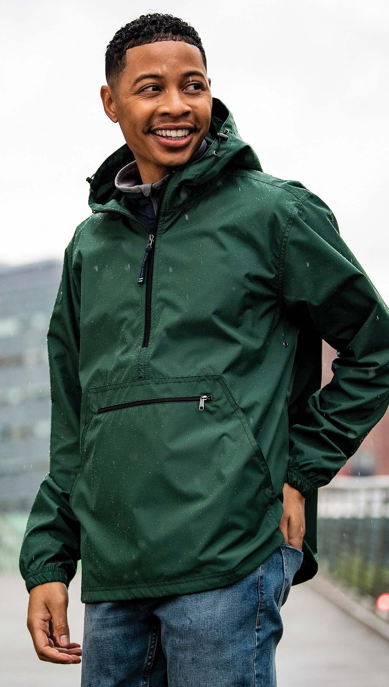 Unisex wind and water-resistant packable pullover made of 100% Softex™ polyester. Quarter-zip design with an extended zipper. Elasticized cuffs and hood with adjustable shockcord drawstring.