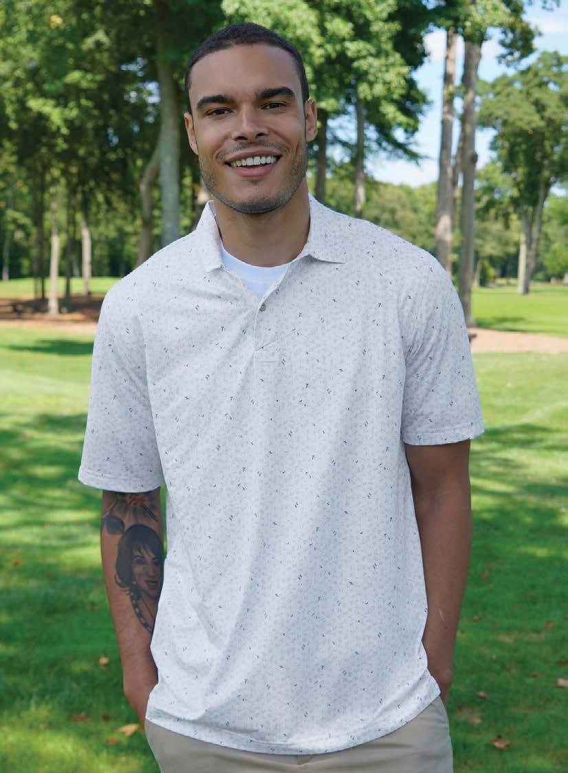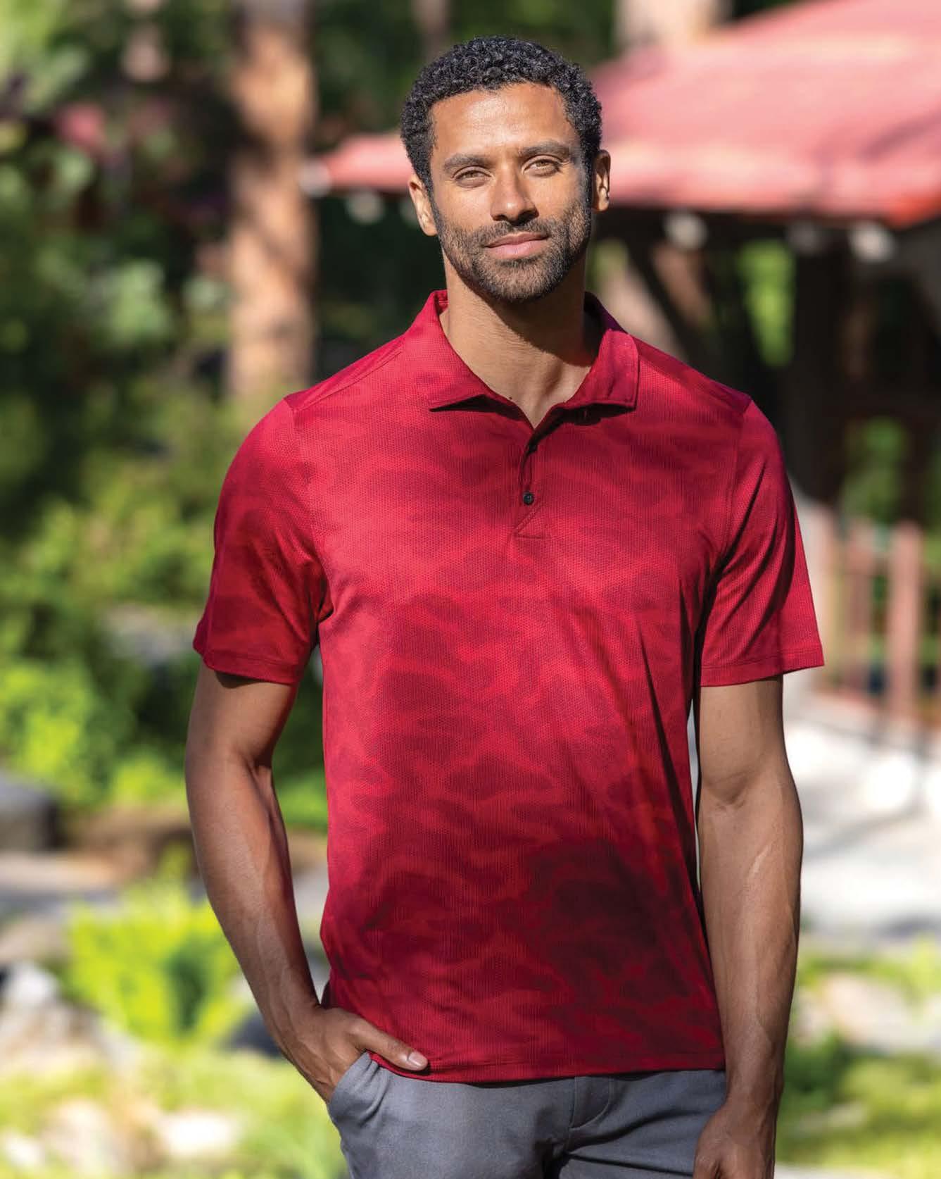 This 92% polyester, 8% spandex jersey polo features a mountain print, moisture-wicking and anti-microbial finish, UPF 50+ sun protection, a self-fabric collar, and a tagless label for all-day comfort.