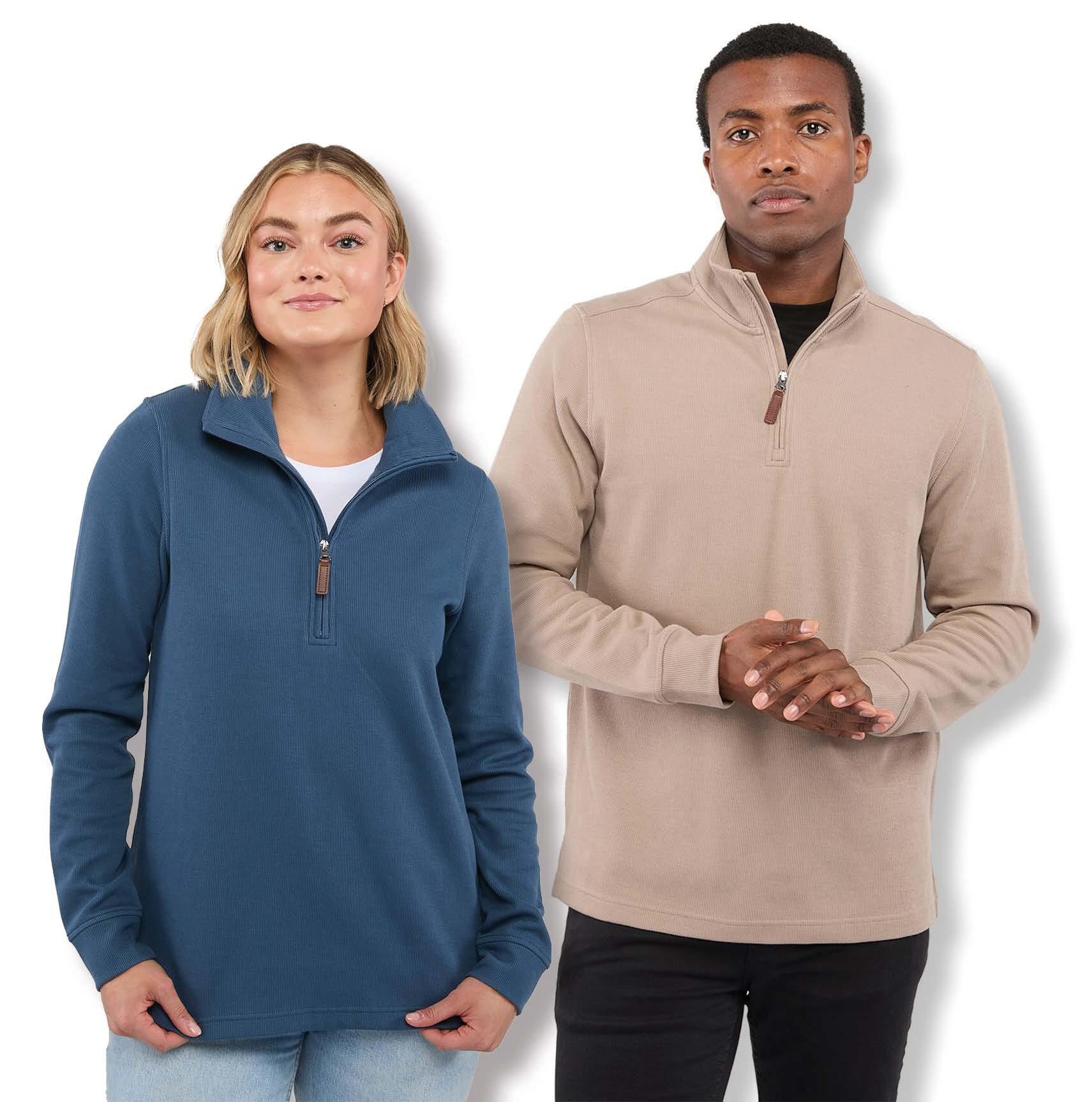 Mid-weight, quarter-zip with on-seam pockets and dyed-to-match, rib-knit trim. Durable metal zipper.