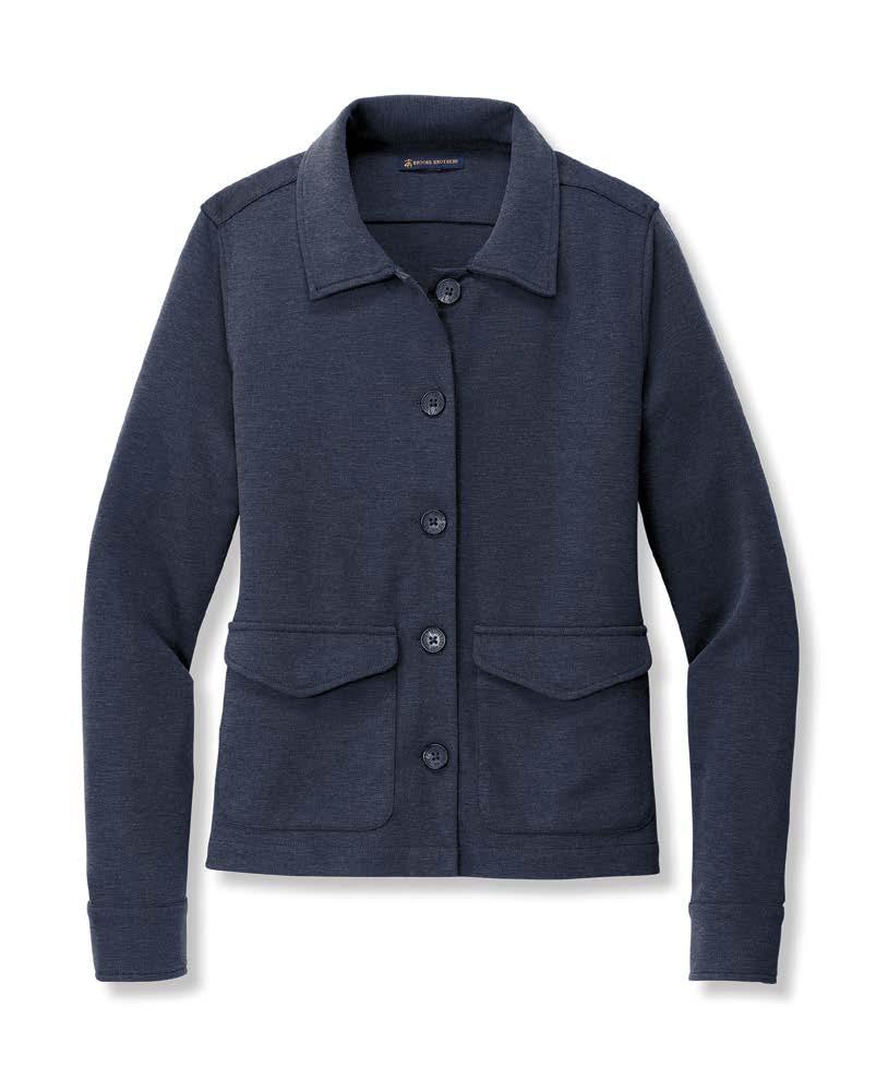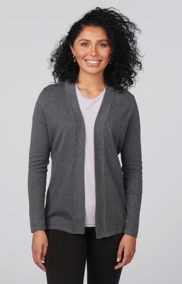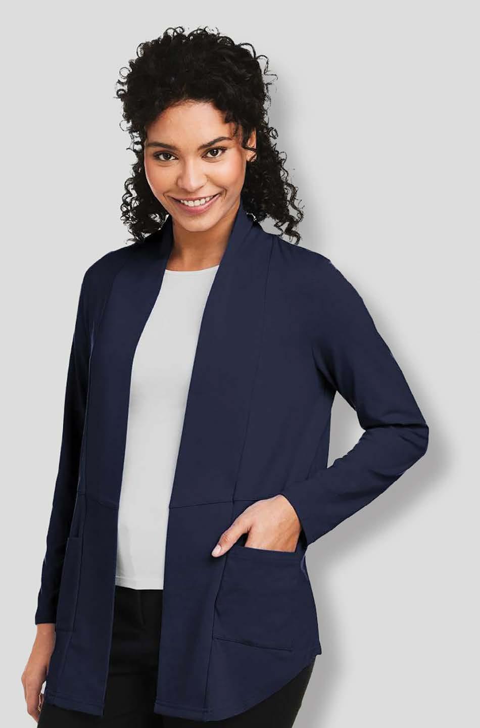 This 6 oz. open-front cardigan, made from a soft cottonrayon-spandex blend, offers moisture-wicking performance, UPF 50+ protection, and features a modified shawl collar with lower patch pockets.