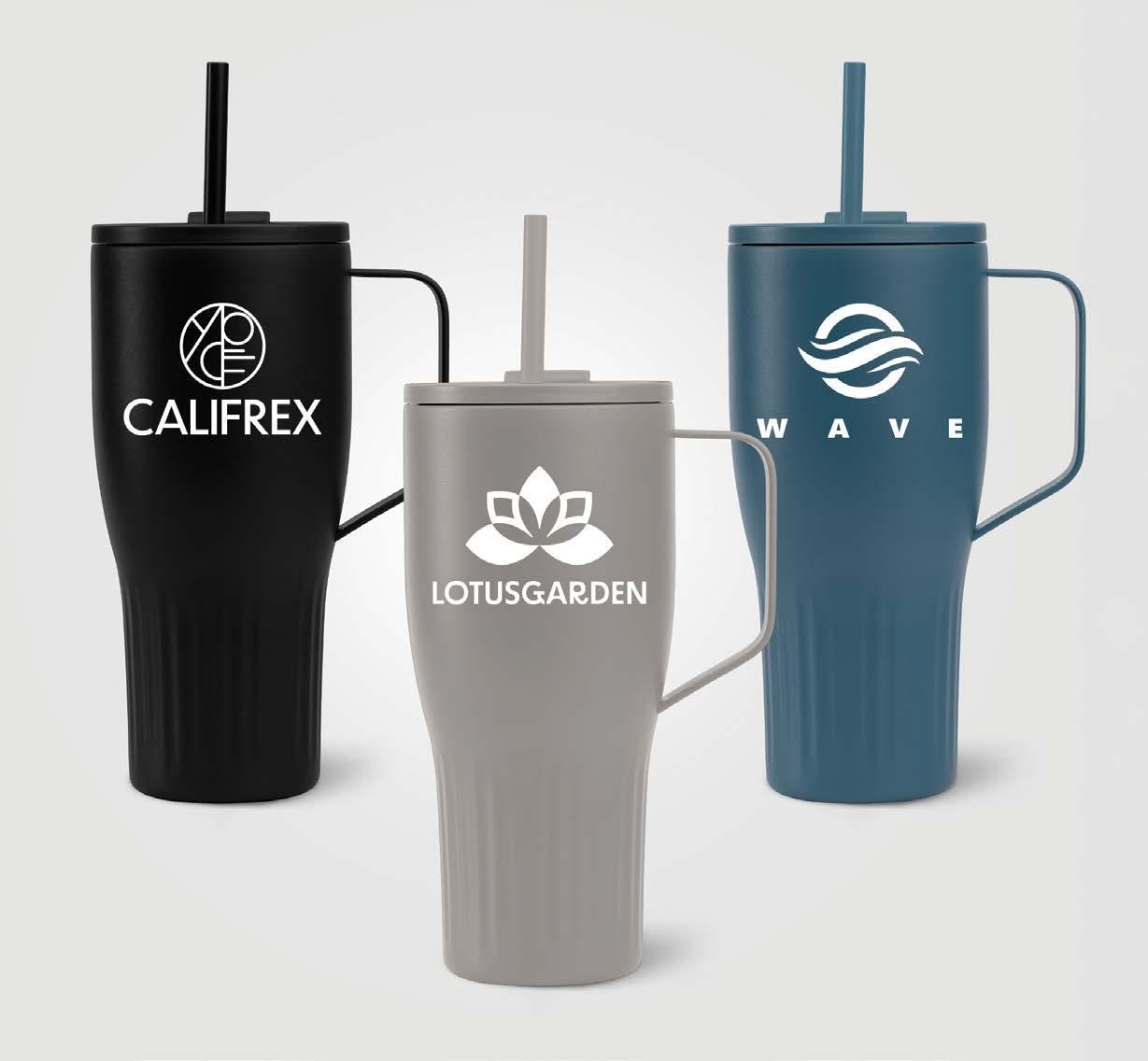 Stainless steel mug with vacuum insulation, clear threaded lid with swivel closure, plastic handle, and matte finish. 16 oz.