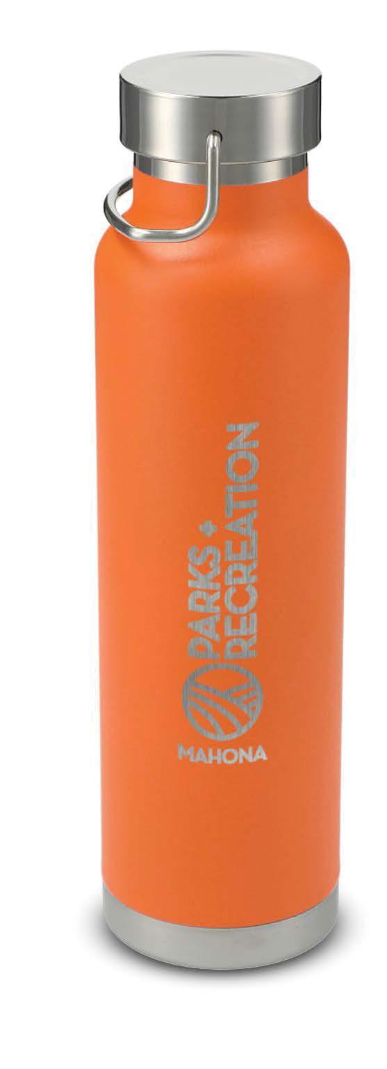 Double wall 90% post-consumer recycled stainless steel water bottle with copper vacuum insulation, threaded lid with flip-up spout, Eastman Tritan™ straw, zinc carrying handle, and powder coated finish. Gift box included. 20 oz. 91/5"H