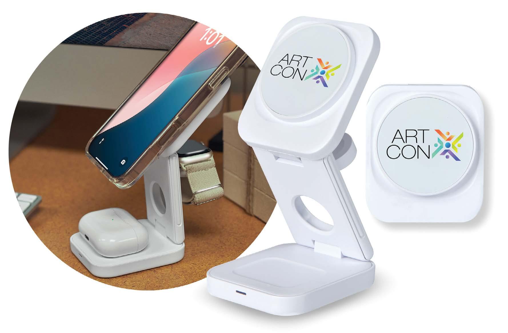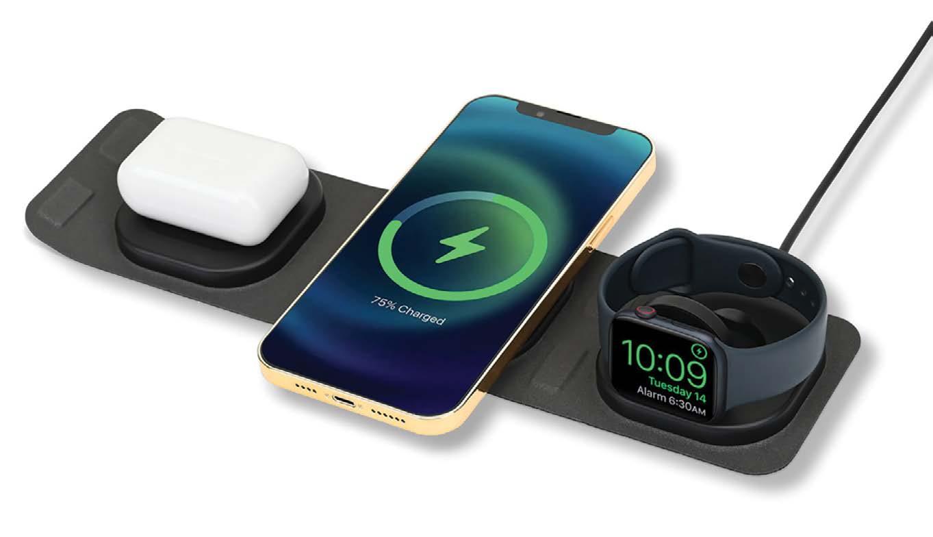 With 15W, 5W, and 2.5W charging locations, this all-inone wireless charging dock and phone stand powers your smartphone, earbuds, and smartwatch simultaneously.