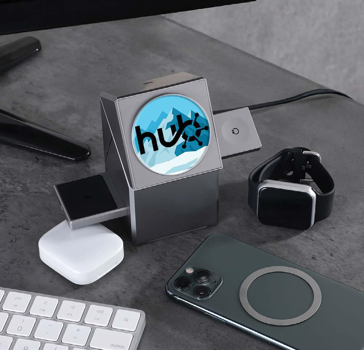 Charging hub with 15W phone charging, 5W Apple Watch power, and 2.5W earbud charging, all with a touch-controlled rotating face for seamless orientation and style.