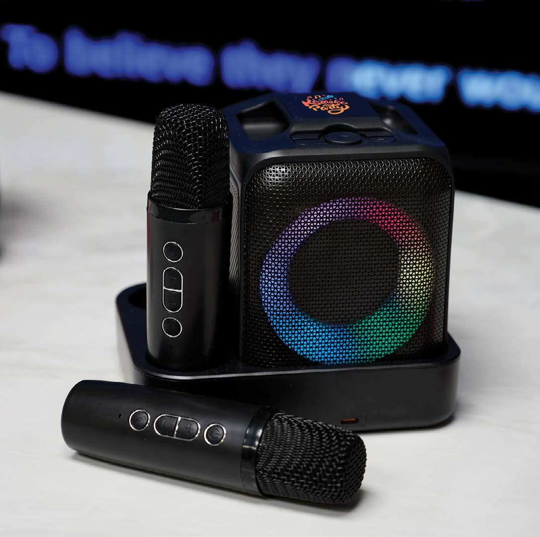 Turn any moment into a stage with this 6W wireless speaker and karaoke set. Features dual mics, dancing lights, and a charging base for endless fun.
