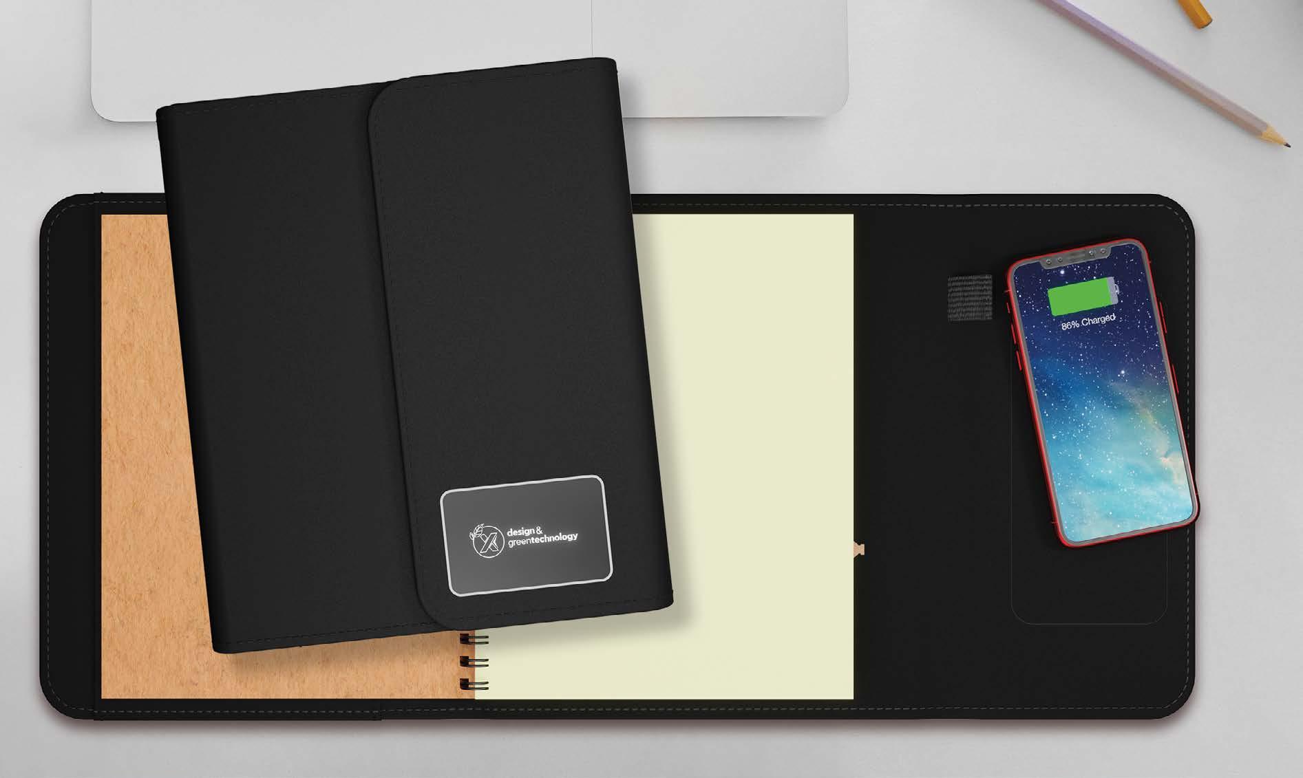 Multifunctional, wireless black charging padfolio that features a built-in 4000 mAh power bank with a 3-in-1 integrated cable. The removable A5 recycled paper notebook is ideal for jotting notes, and the light-up logo brings a bit of fun to everyday office life.