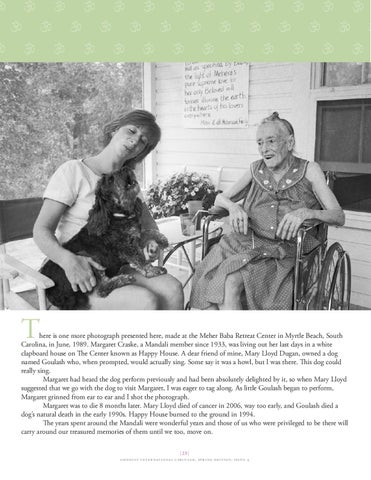 here is one more photograph presented here, made at the Meher Baba Retreat Center in Myrtle Beach, South Carolina, in June, 1989. Margaret Craske, a Mandali member since 1933, was living out her last days in a white clapboard house on The Center known as Happy House. A dear friend of mine, Mary Lloyd Dugan, owned a dog named Goulash who, when prompted, would actually sing. Some say it was a howl, but I was there. This dog could really sing. Margaret had heard the dog perform previously and had been absolutely delighted by it, so when Mary Lloyd suggested that we go with the dog to visit Margaret, I was eager to tag along. As little Goulash began to perform, Margaret grinned from ear to ear and I shot the photograph. Margaret was to die 8 months later. Mary Lloyd died of cancer in 2006, way too early, and Goulash died a dog’s natural death in the early 1990s. Happy House burned to the ground in 1994. The years spent around the Mandali were wonderful years and those of us who were privileged to be there will carry around our treasured memories of them until we too, move on. | 23 | o m p o i n t i n t e r n a t i o n a l c i r c u l a r , s p r i n g e d i t i o n, i s s u e 4