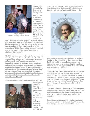 During 1952, shortly before Don meets Baba, a letter came from Baba to Don, in which he refers to Don as "my son." Unfortunately, Meher Baba is involved in an automobile accident while traveling from Don, Jill English Myrtle Beach, Leonard English, Kathy Harris South Carolina to Ojai, California, and never got past Oklahoma. Instead, Don travelled to meet Baba in New York at Ivy Duce's Manhattan apartment. After this initial meeting, a letter came from Baba to Don, referring to Don as "my spiritual son." Meher Baba explains about the "spiritual son" of the Master in Discourses,4 in relation to obedience (bold is mine): "Such literal obedience is not even bound by the requirement that the real significance of the orders should be within the intellectual comprehension of the pupil, and it is the best type of obedience for which you can aspire. Through such implicit and unquestioning obedience, all the crooked knots of your desires and sanskaras are set straight. It is also through such obedience that a deep link is created between the Master and the pupil, with the result that there is an unhindered and perennial flow of spiritual wisdom and power into the pupil. At this stage the pupil becomes the spiritual son of the Master, and in due time he is freed from all individualistic and sanskaric ties. Then he himself becomes a Master." Another statement from Baba was that Don has, "An almost perfect balance of head and heart." Don wrote to me, "I was reminded by Bal Natu of two brief but very important actions by Baba as he returned from Don & Kathryn Harris the 1952 visit