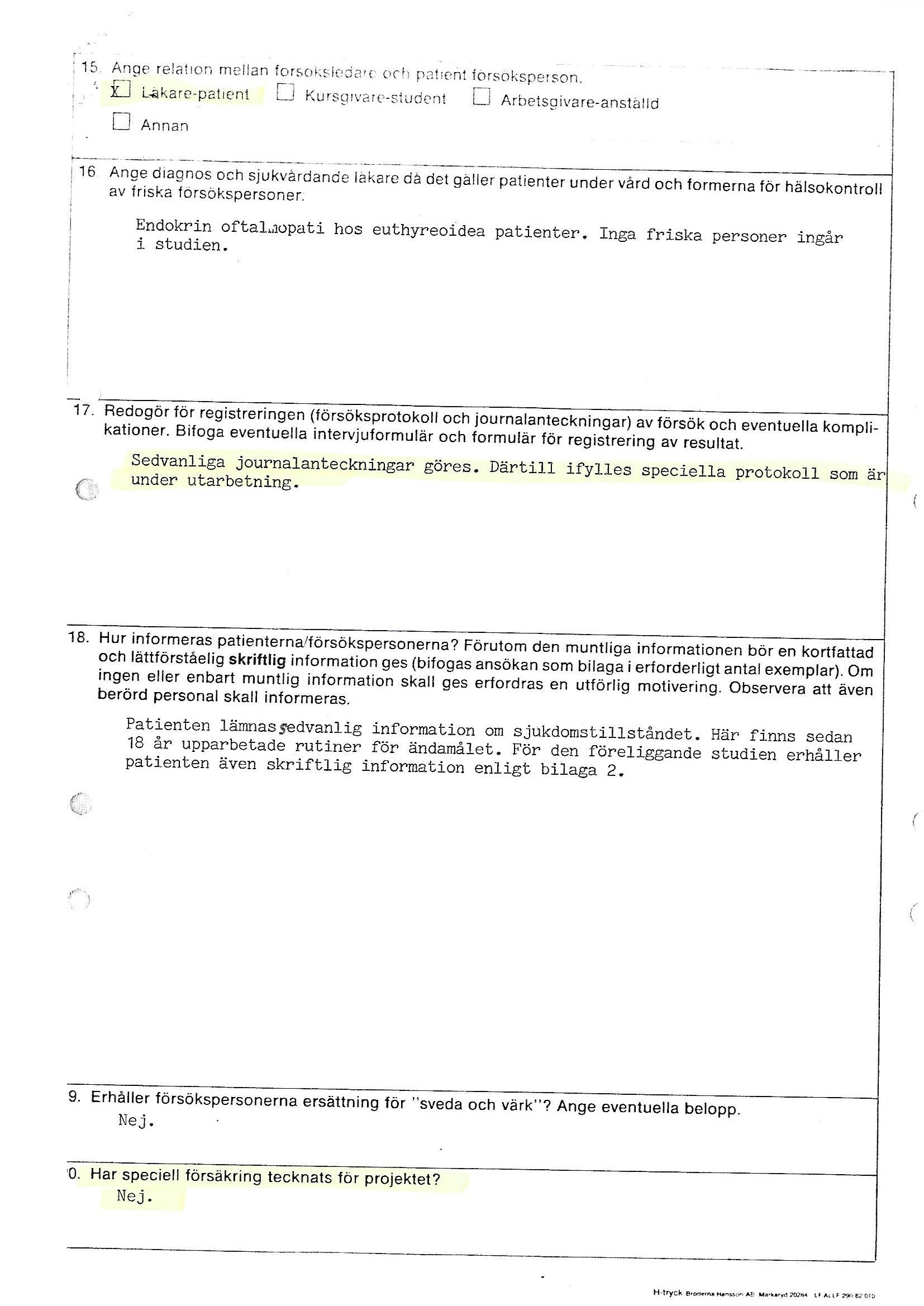 Med ansökan KI 83-76 medföljde PATIENTINFORMATION daterad 1983-04-26 (1 sida) och beskrivning av KLINISKA STUDIER AV BEHANDLING AV HYPERTHYREOS OCH ENDOKRIN OFTALMOPATI daterad 1983-04-19 (13sidor). De kliniska studierna är uppdelade i fyra delstudier. STUDIE A: Jämförelse av behandlingsmetoder, yngre grupp. STUDIE B: Jämförelse av behandlingsmetoder, äldre grupp. STUDIE C: Jämförelse behandlingsmetoder, oftalmopati. STUDIE D: Jämförelse behandlingsmetoder, oftalmopati, euthyreoida försöksobjekt.
