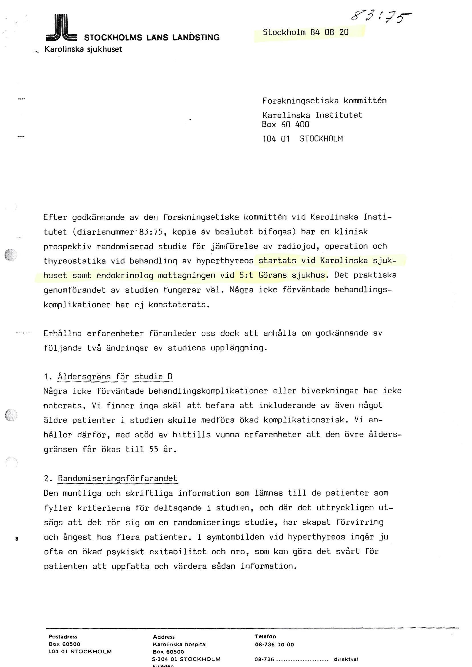 1984-08-20 AnhållantillForskningsetiskakommittéomgodkännandeavtvåändringarav studiensuppläggning.