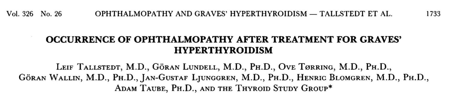 IartikelpubliceradiNewEnglandJournalofMedicineijuni1992stårattallaiTT-83 studiensom cksköldkörtelnopereradförtyreotoxikospåKSKirurgiskaklinikenbehandlades medLevaxinefteroperationenförattundvikahypothyreos.