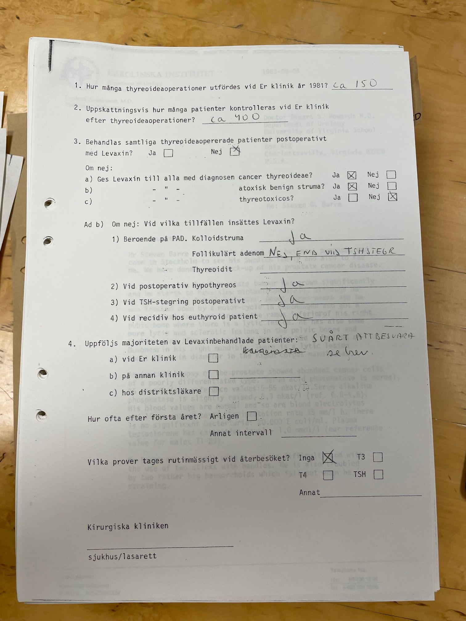 Ioktober1983skickarforskarevidKirurgiskaklinikenvidMalmöallmännasjukhusett brevochenenkättillKirurgiskaklinikenvidKarolinskasjukhuset(KS).Forskarna berättarattdehållerpåmedenstudieombehovetavbehandlingmedsyntetisksköldkörtelhormon(Thyroxin,Levaxin)eftersköldkörteloperation.