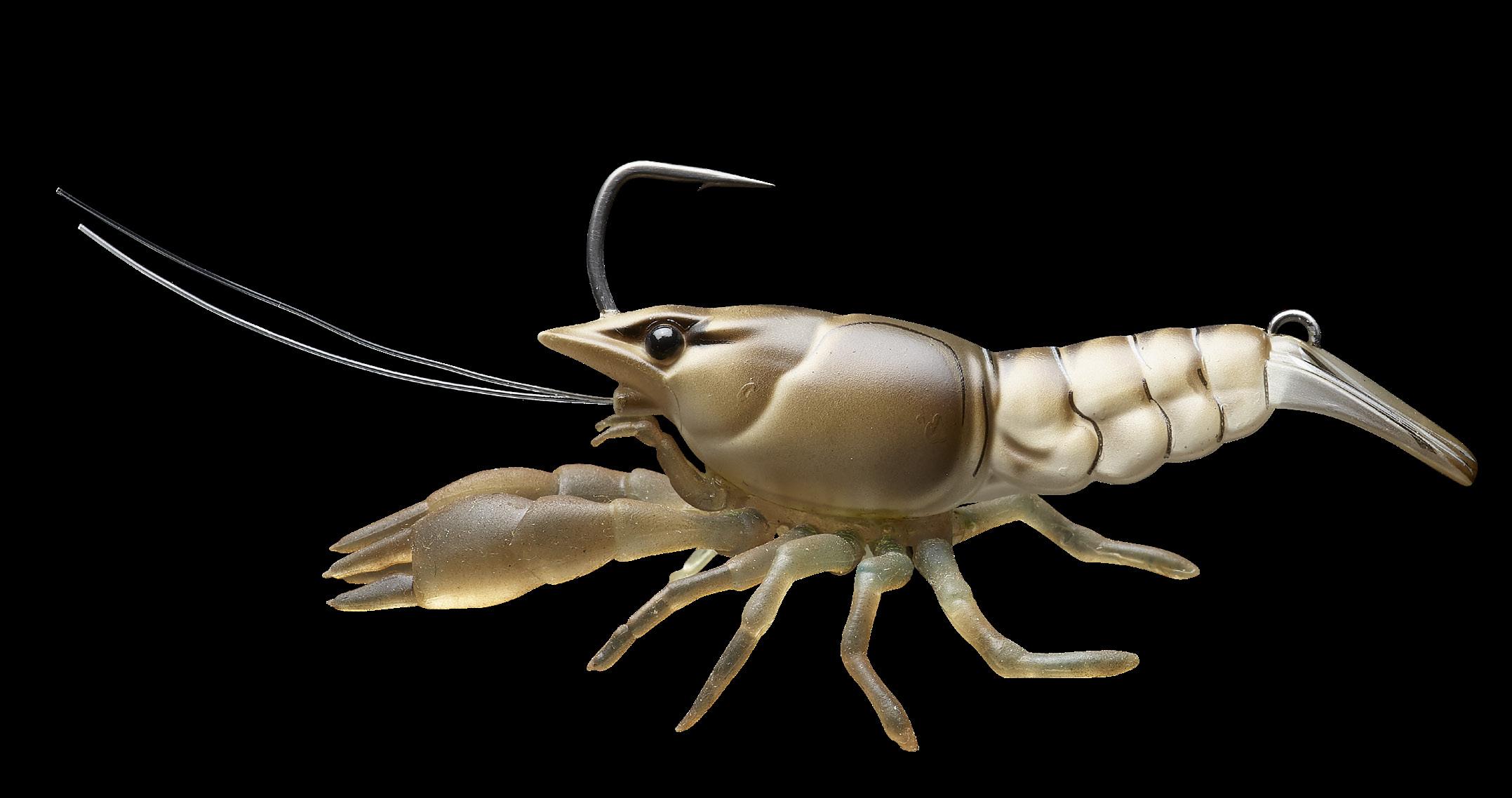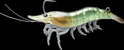 Mimics a vulnerable Shrimp exposed in open water, falling to the security of bottom cover. Twitch it to create an erratic action or wind it slowly to generate a thumping pulse. The body is made from ABS plastic and is buoyant. Inside the body cavity is a round weight that generates a light clicking sound when the bait is in motion. The legs and swimmerets are made from TPE soft plastic. The swing weight is