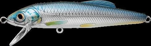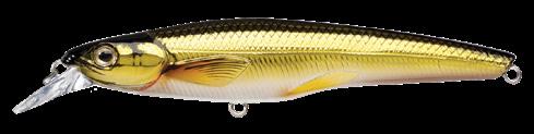 anglers targeting fish around cover, such as rock or wood. The bait sinks approximately 1’ every 3 seconds and falls parallel. Equipped with a weight transfer, which generates a dense knock sound. Ultra-realistic paint finishes make this Minnow imitation ideal for targeting fresh and saltwater game fish.