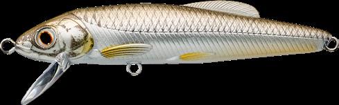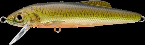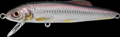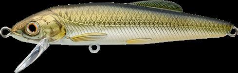 The LIVETARGET Minnow finesse jerkbait is a one-ofkind Minnow replica. The high-impact polycarbonate lip is installed separately from the main body fuselage. This unique design feature enables the lure to behave erratically when twitched, which perfectly represents the movement of a distressed minnow. The lip is extremely durable and has excellent deflection properties making it a great option for