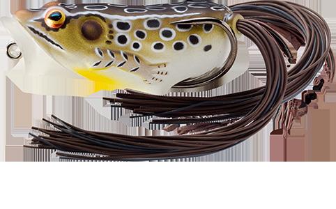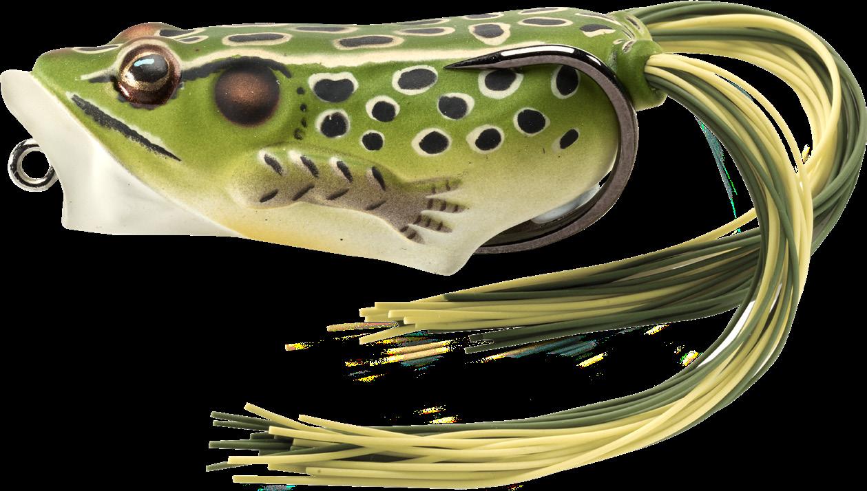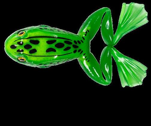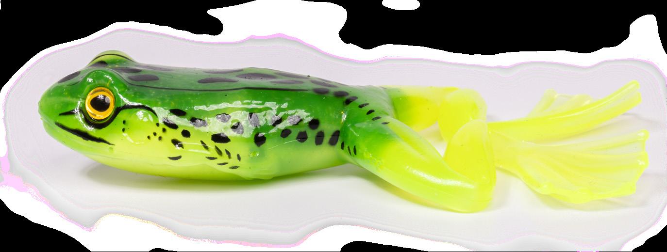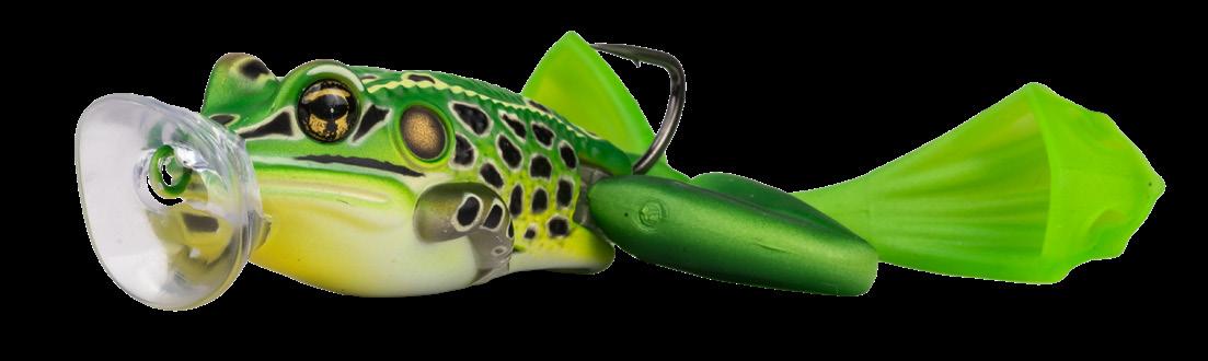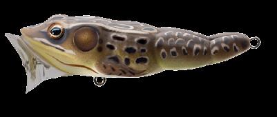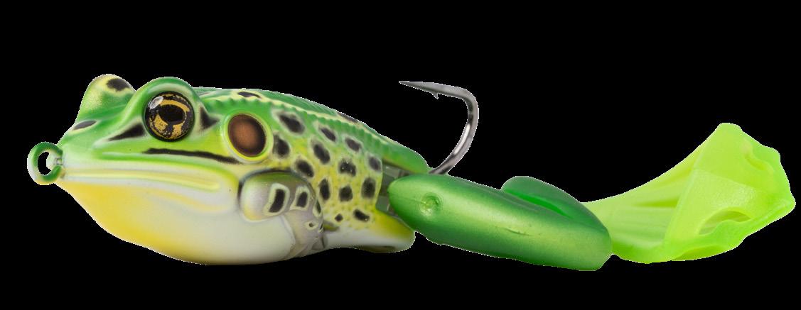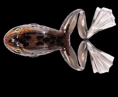 durability. As an unrigged topwater soft plastic frog, LIVETARGET’s latest frog lure maintains its stride action at any retrieval speed, displaying life-like leg pushes on the surface. Rig with a single wide gap Mustad EWG Infiltrator hook or Mustad double frog hook for a weedless presentation to flip toward lily pads or under docks when fishing for top-feeding bass and pike.