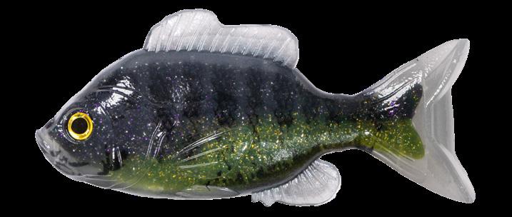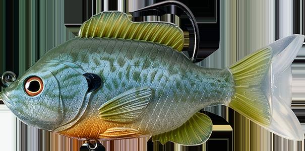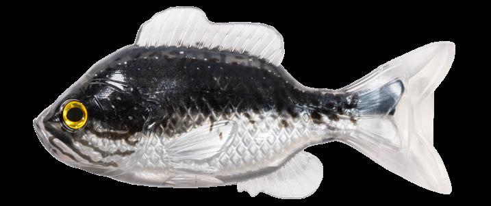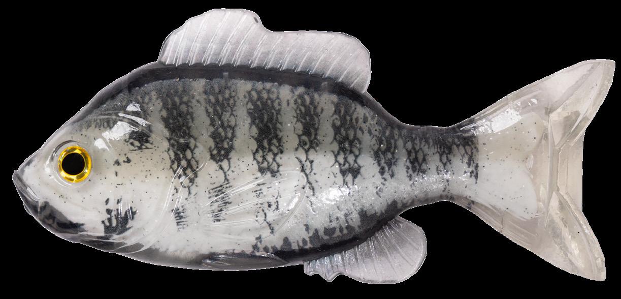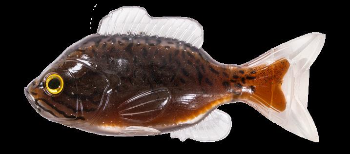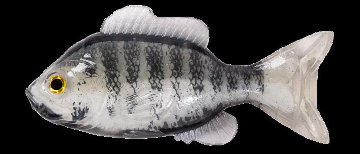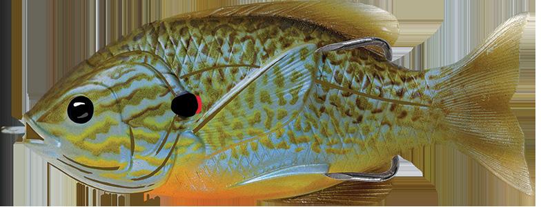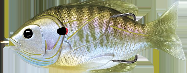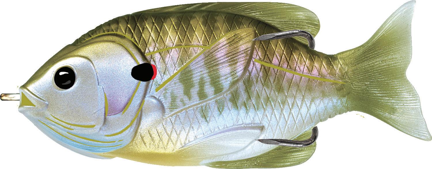 oscillator tail, molded from a transparent exoskeleton. This design imparts a fluid side-to-side swimming motion and rhythmic tail beat without compromising the lure’s natural appearance. Rigging the LIVETARGET Sunfish is both straightforward and efficient, thanks to features such as a split belly and dorsal fin, which allow for effortless hook concealment and optimal penetration upon a strike.