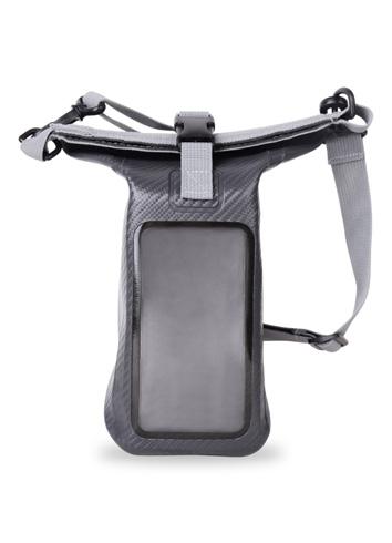 Water-resistant roll top bag for the storage of cameras and phones. Made of weatherproof PVC. Featuring an outer phone bag accessed from the inside of the bag to prevent water penetration.