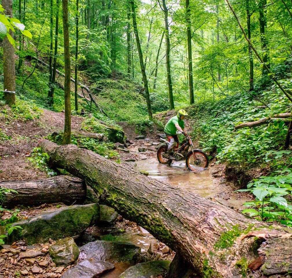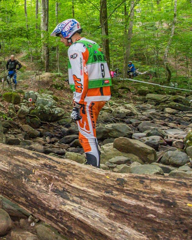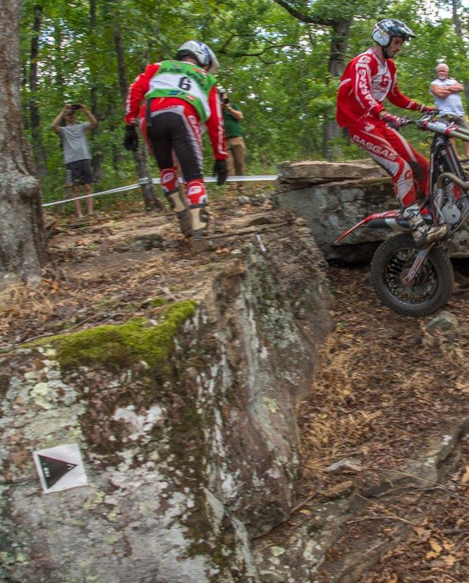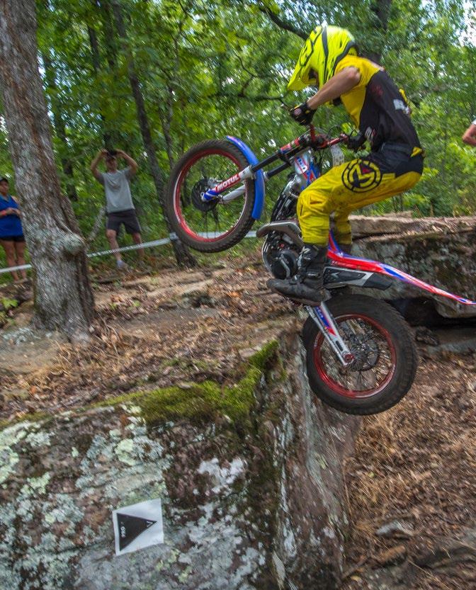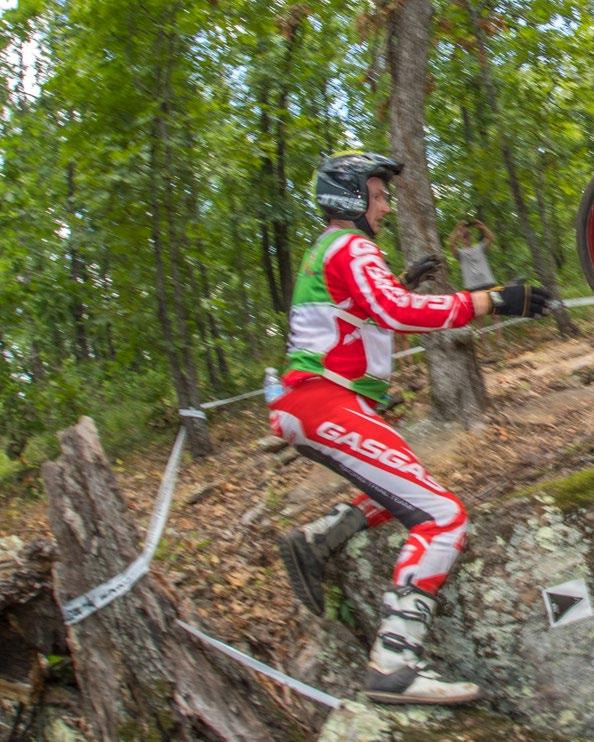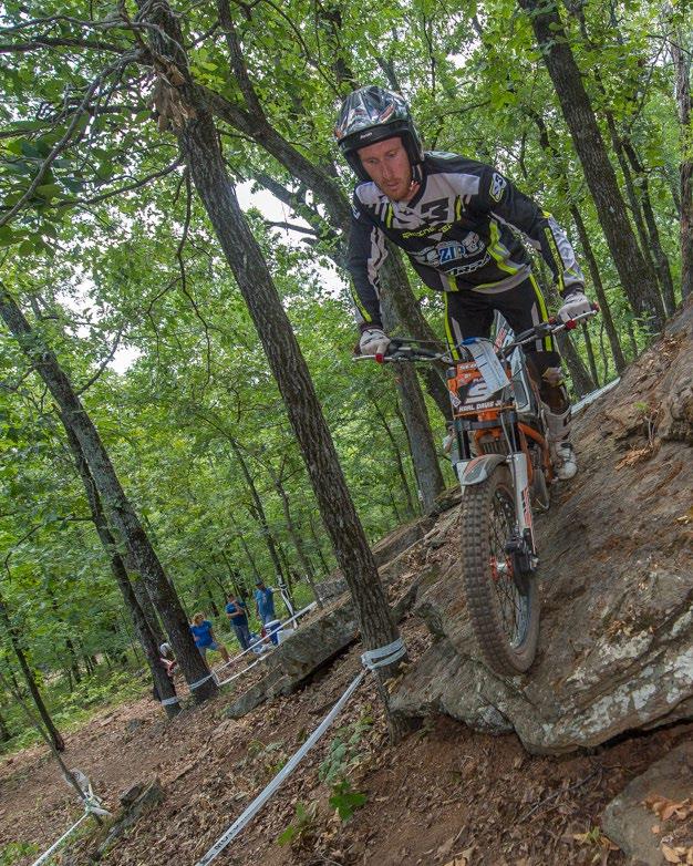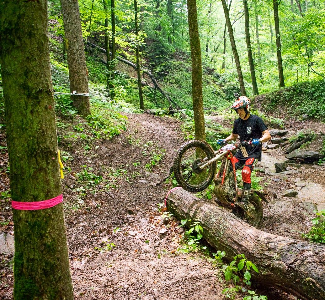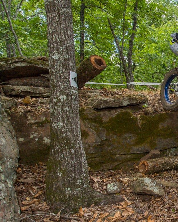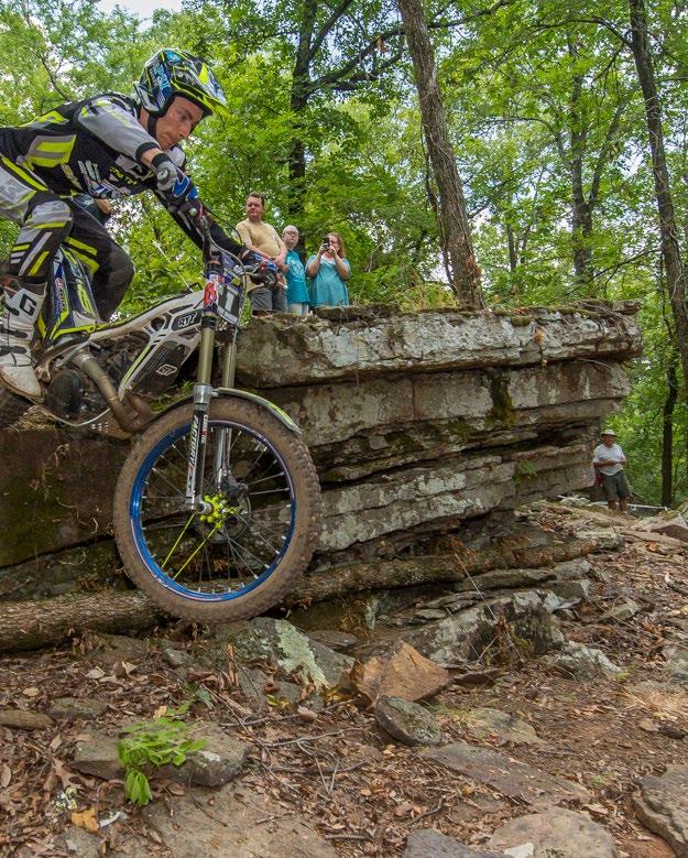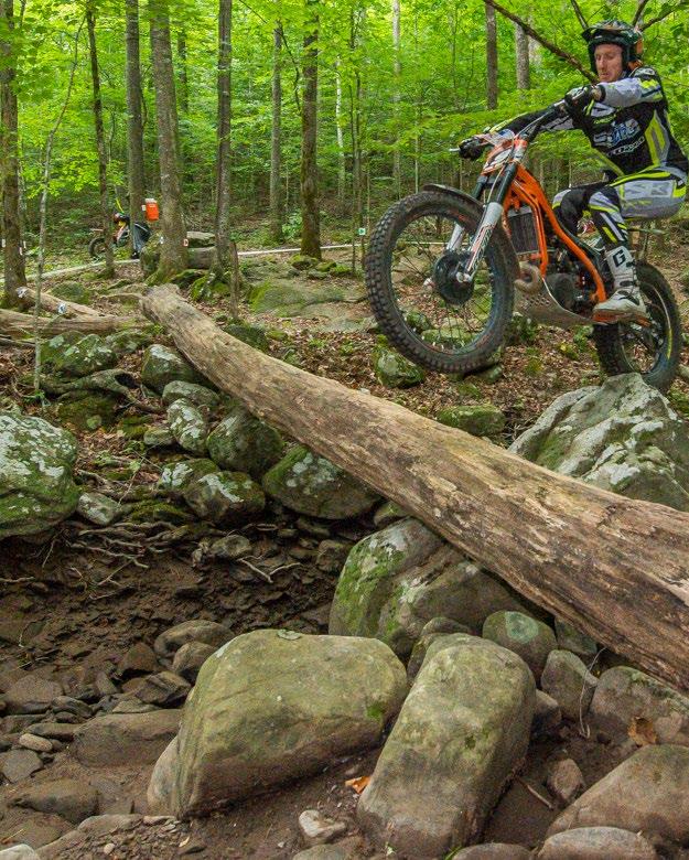Karl Davis Jr. carves a narrow line across the top of this rock/log combination at the US National MotoTrials in Tennessee. The Scorpa USA rider took a third and a second over the two day event.