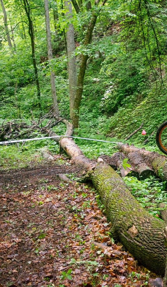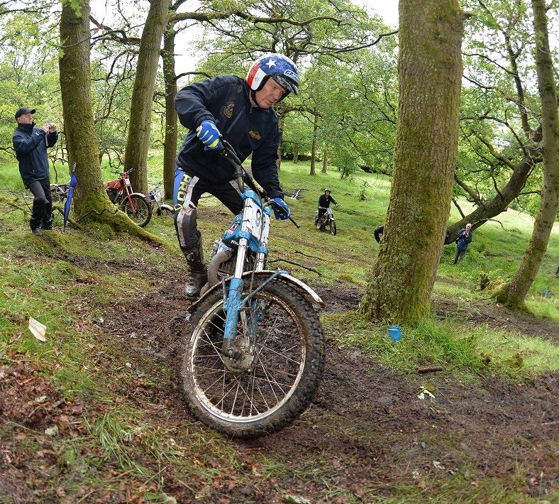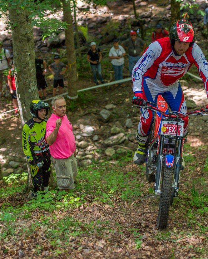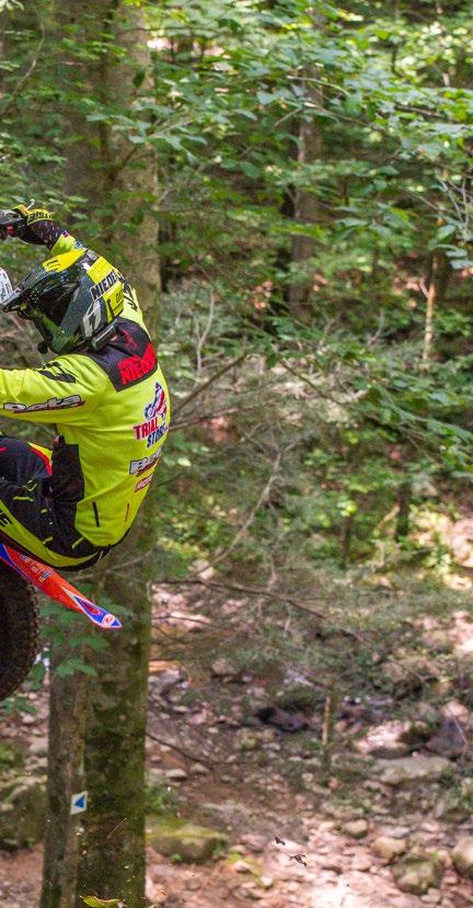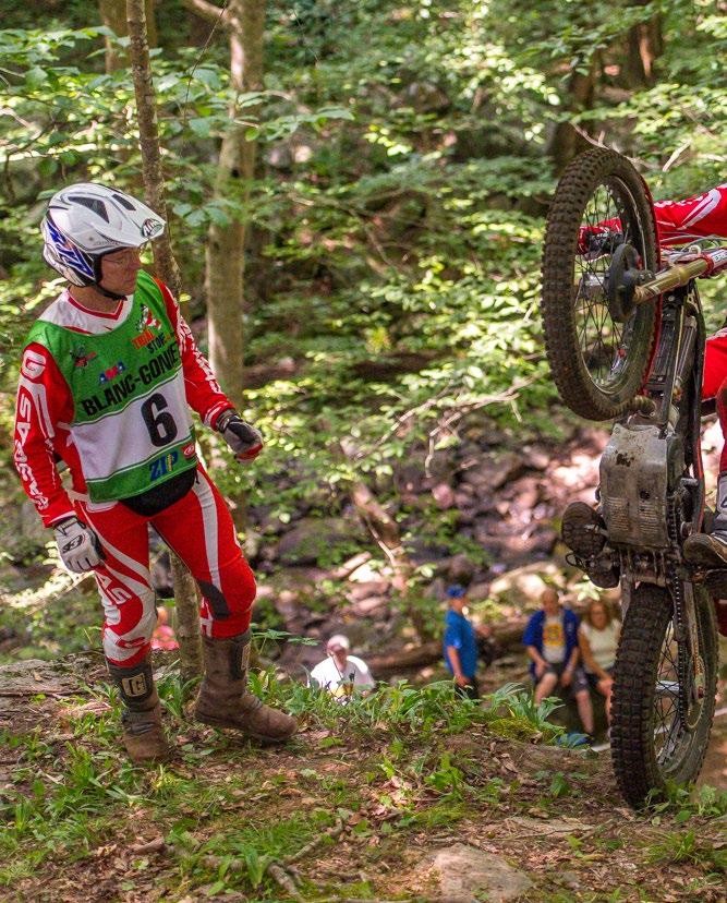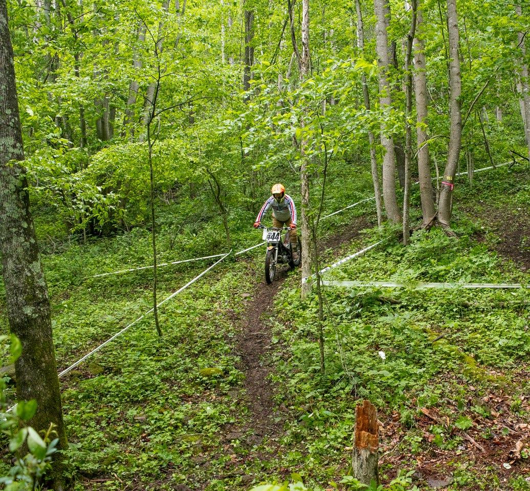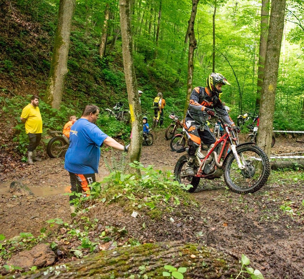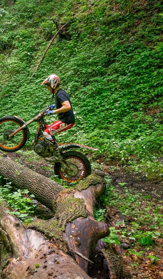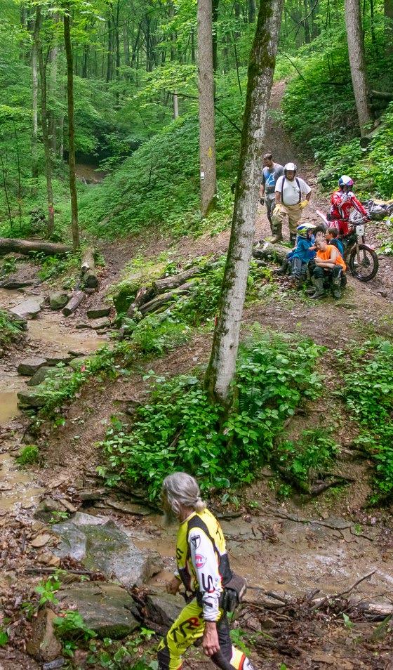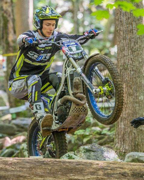 Karl Davis Jr. carves a narrow line across the top of this rock/log combination at the US National MotoTrials in Tennessee. The Scorpa USA rider took a third and a second over the two day event.