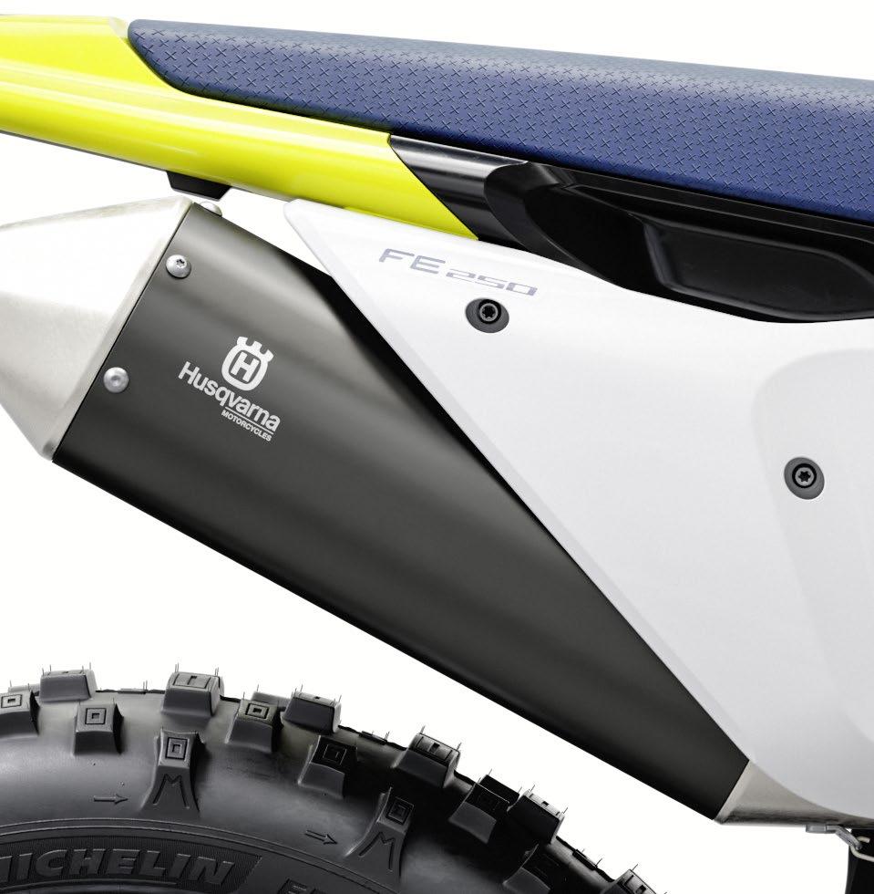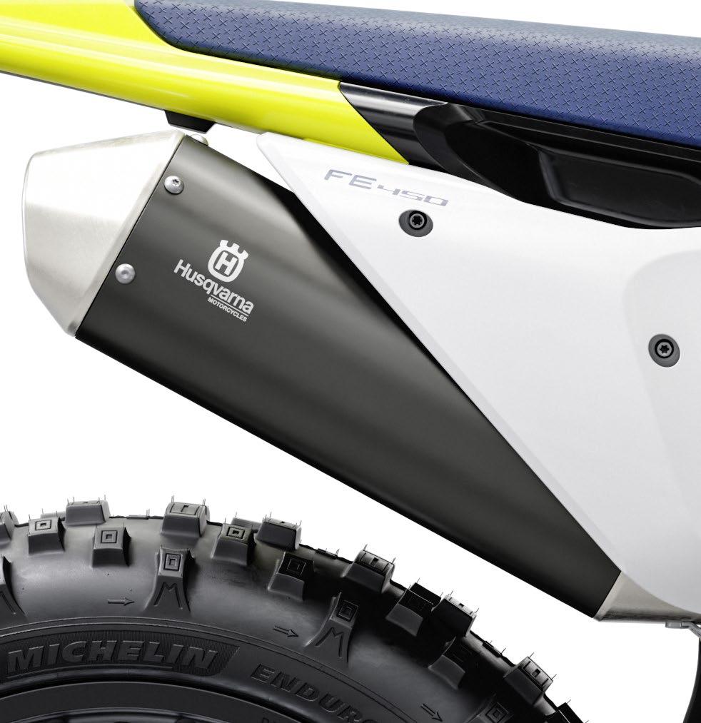 guir motores más compactos. El diámetro del tubo colector en los modelos FE 450 y FE 501 se ha reducido al mismo tamaño que el del modelo FC 450 de motocross para permitir una mejor respuesta del motor a menos rpm y aumentar la potencia máxima.