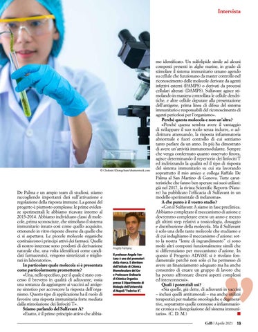 mo identificato. Un sulfolipide simile ad alcuni composti presenti in alghe marine, in grado di stimolare il sistema immunitario umano agendo su cellule che funzionano da master controllo nel riconoscimento delle molecole derivate da agenti infettivi esterni (PAMPS) o derivati da processi cellulari alterati (DAMPS). Sulfavant agisce stimolando in maniera controllata le cellule dendritiche, e altre cellule deputate alla presentazione dell’antigene, prima linea di difesa del sistema immunitario e responsabili del riconoscimento di agenti pericolosi per l’organismo». Perché questa molecola e non un’altra? «Perché questa sembra avere il vantaggio di sviluppare il suo ruolo senza indurre, o addirittura attenuando, la risposta infiammatoria abnormale e fuori controllo di cui sentiamo tanto parlare da un anno. In più ha dimostrato di avere un’attività immunomodulante. Sempre che venga confermato quanto osservato finora, agisce determinando il repertorio dei linfociti T ed indirizzando la qualità ed il tipo di risposta del sistema immunitario su cui sta lavorando soprattutto il mio amico e collega Raffale De Palma al San Martino di Genova. Tutte caratteristiche che fanno ben sperare sui suoi utilizzi: già nel 2017, la rivista Scientific Reports (Nature) ha pubblicato l’efficacia di Sulfavant in un modello sperimentale di melanoma». A che punto è il vostro studio? «Con il Sulfavant A siamo in fase preclinica. Abbiamo completato il meccanismo di azione e dovremmo completare entro un anno e mezzo gli ultimi step relativi a tossicologia, dosaggio e distribuzione della molecola. Ma il Sulfavant è solo una delle tante molecole che studiamo e di cui indaghiamo il meccanismo d’azione: sotto la nostra “lente di ingrandimento” ci sono molti altri composti funzionalmente simili che si differenziano per meccanismo d’azione. In questo il Progetto ADViSE si è rivelato fondamentale perché non solo ci ha permesso di avere un finanziamento adeguato ma ha anche consentito di creare un gruppo di lavoro che ha potuto affrontare diversi aspetti complessi ed interconnessi». Quali i potenziali usi? «Sia quelle, già dette, di adiuvanti in vaccini – inclusi quelli antitumorali – ma anche utilizzi terapeutici per malattie oncologiche e degenerative, soprattutto quelle connesse a infiammazione cronica o disregolazione del sistema immunitario». (C. D. M.) GdB | Aprile 2021