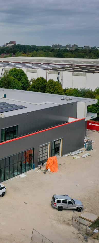Chris: ‘Het pand is nagenoeg nul-op-de-meter. Er liggen 342 zonnepanelen op het dak en we hebben twee megabatterijen voor energieopslag. We proberen zoveel mogelijk zelfvoorzienend te zijn. We maken gebruik van hoogwaardige isolatie en in het hele pand ligt vloerverwarming. In de werkplaats hebben we snelsluitdeuren tegen warmteverlies. Ook het sluissysteem bij de hellingbaan voor auto’s zorgt voor energiebesparing. De ene roldeur gaat pas open als de andere gesloten is. Zo houden we in de zomer de warmte binnen en in de winter de kou buiten. Er is echt overal aan gedacht.’