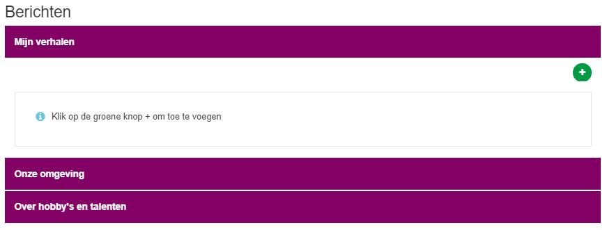 Je ziet hieronder een volgende schermafbeelding ‘Berichten’. Om een bericht te plaatsen, ziet het kind een groene knop. Hiermee kan het kind een eigen bericht toevoegen aan zijn/haar verhaal.