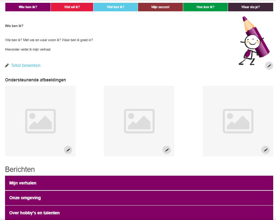 Als school of als leraar heb je de mogelijkheid om de teksten en afbeeldingen aan te passen in het kindportfolio. Zodoende kun je de inhoud en sturing passend maken in jullie onderwijs.