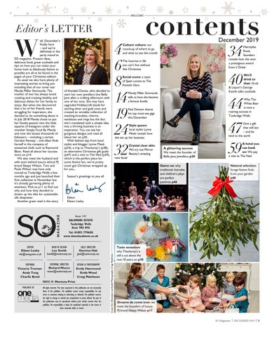 ell, December’s finally here – and we’re definitely in the party mood at SO magazine. Present ideas, delicious food, great cocktails and tips on how you can make your home look as fabulously festive as possible are all to be found in the pages of your Christmas edition. As usual we also have plenty of interesting stories to bring you including that of our cover star Mandy Miller Simmonds. The mother of two has always loved cooking and creating healthy and delicious dishes for her family to enjoy. But when she discovered that a lot of her friends were struggling for inspiration, she decided to do something about it. In July 2018 Mandy chose to put her foodie passion into the little squares of Instagram under the moniker Simply Food By Mandy and now she boasts thousands of followers – including a certain Gordon Ramsay – and often finds herself in the company of esteemed chefs such as Raymond Blanc. Read all about her success story on p14. We also meet the husband and wife team behind luxury ethical PJ brand Sleepy Wilson. Tom and Paula Wilson may have only moved to Tunbridge Wells a few months ago and just launched their first collection in November but it’s already garnering plenty of attention. Flick to p11 to find out why and how they decided to dream up the idea for sustainable silk sleepwear. Another great read is the story