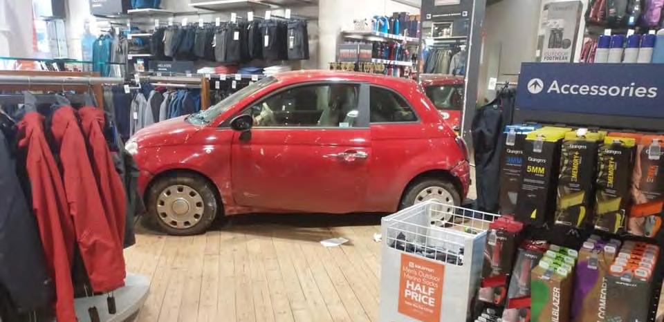Emergency services were called on Friday April 28 at 11.27am after a red Fiat 500 crashed into the Blacks store, where paramedics treated three people for minor injuries.