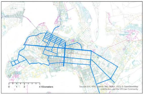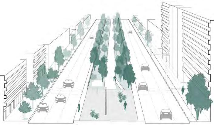 This chapter details the road network strategy for freight movements with proposed interventions for a heavy traffic limited zone, outlining short- and longterm solutions. It is followed by detailed proposals for short- and long-term interventions for the road network, including current and envisaged road sections for the intervention typologies. The report concludes with a series of guidelines for street design to ensure accessibility, multimodality, versatility, and safety.