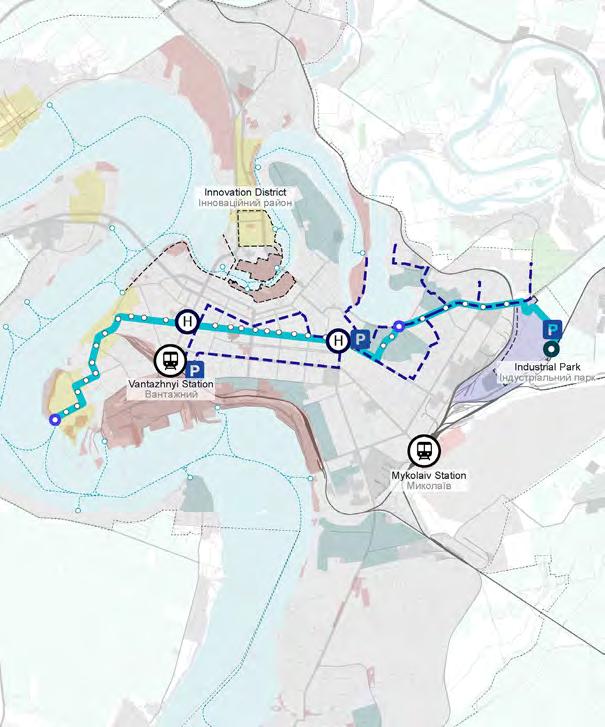 The railway network strategy is crucial to enhancing transportation efficiency in Mykolaiv. By integrating railways into the urban landscape, the plan aims to minimise their barrier effect, improve connectivity to the airport, and repurpose industrial railway tracks for urban regeneration.