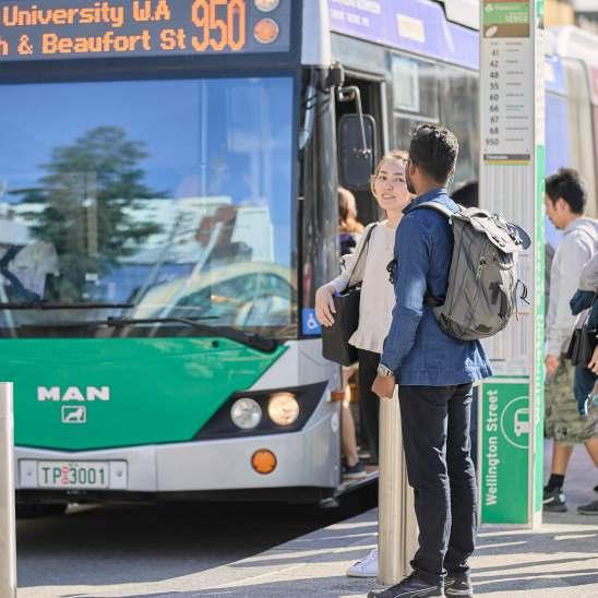 Transperth's 950 'Superbus' – Perth's highest frequency service – services UWA. Running every one to four minutes during peak hour, the 950 runs between Morley Busport and QEII via UWA and Perth.