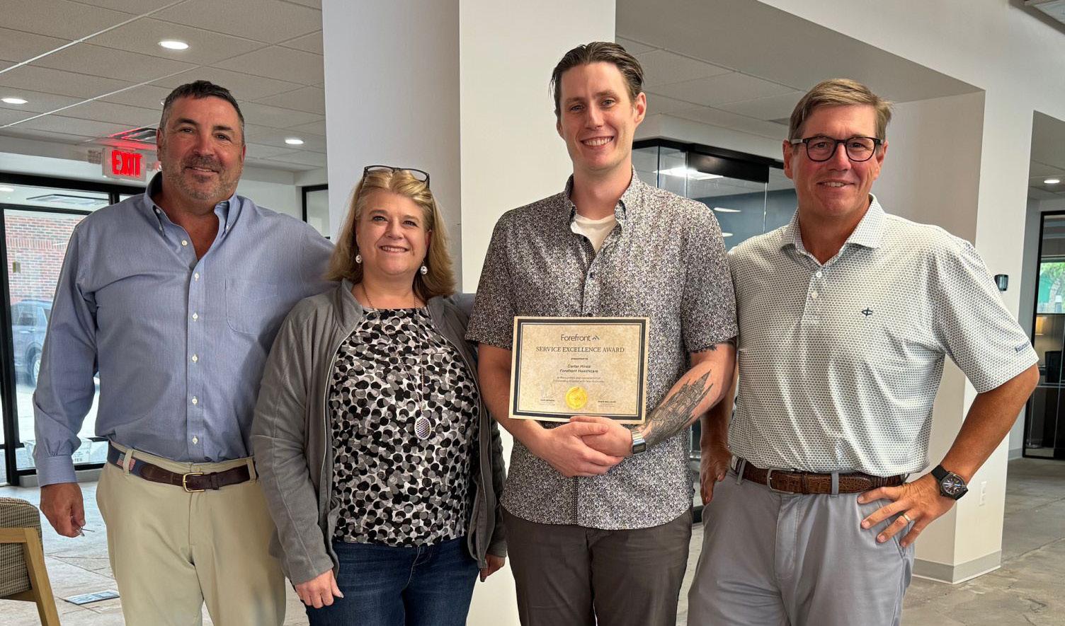 At Forefront, we demonstrate our mission of service each day by providing nutritious food and maintaining clean environments. But Service Excellence, one of our six core values, extends beyond the walls of our client facilities to our back office support team. In September, Co-Founders Dan Bowen and Ryan Willilams presented Carter Hines, HR Coordinator, with a Service Excellence award for his outstanding work with new account onboarding. During 2024, Carter personally onboarded more than 400 associates. Congratulations, Carter, and thanks for all you do for the Forefront team!
