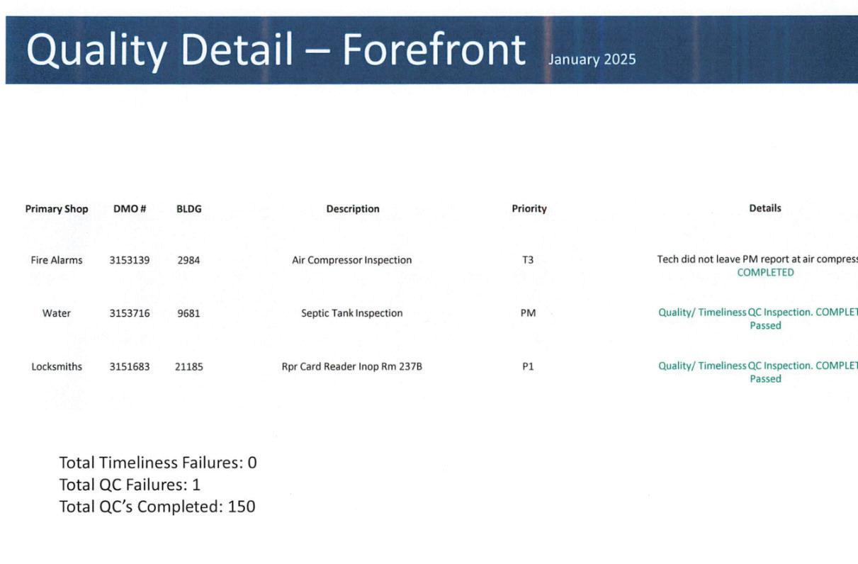 For Forefront’s Fort Bliss Base Operations Support contract performance is assessed by three Government Quality Assurance Inspectors (QAIs), three PRIDE QC inspectors, and Forefront supervisors. These six individuals are responsible for reviewing completed work processes to assess the quality of services provided. Quality points are measured in three key areas: the quality of work, administrative actions required by each process, and the timeliness of service delivery in comparison to PWS requirements. Results are tabulated and reviewed monthly to determine performance levels.
