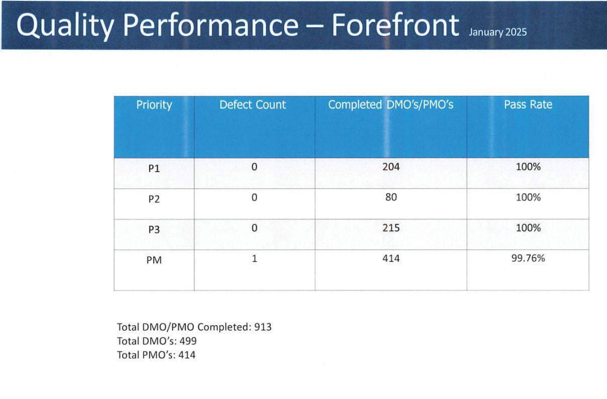 In conclusion, performance on federal contracts is evaluated monthly by both the government and the contractor. Forefront compiles all inspection results and data, which are presented to both our prime contractor (PRIDE) and the government during monthly performance reviews.