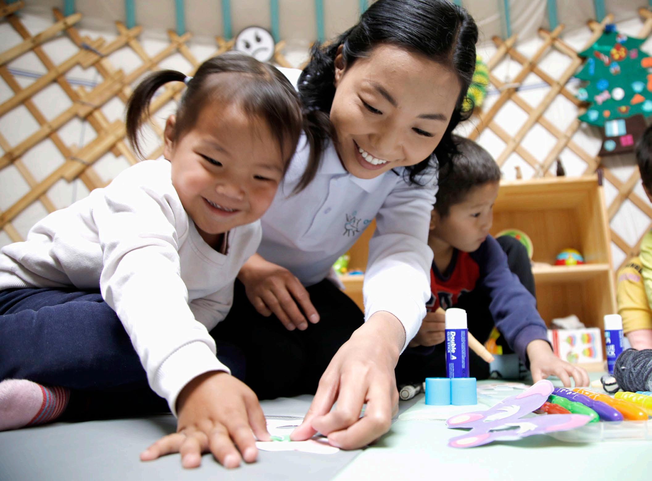In Mongolia, we completed six parent training cohorts at the OneSky Family Center. We also launched cooperative play care groups with parents and children to help build community among migrant families. And, to support play and learning at home, we provided educational kits with toys and books to 169 families.
