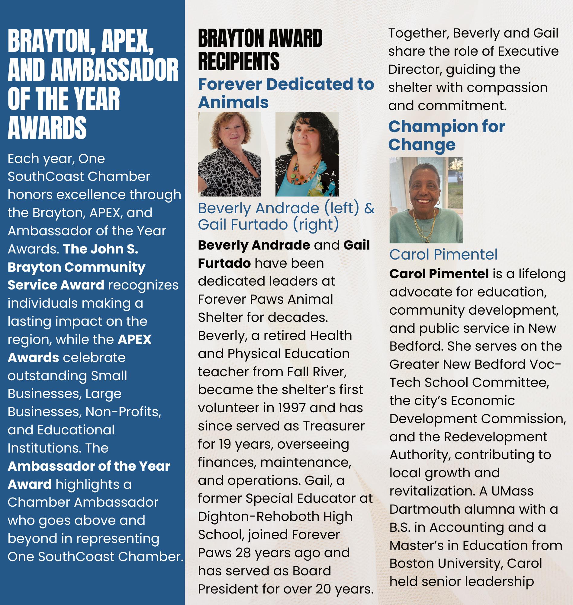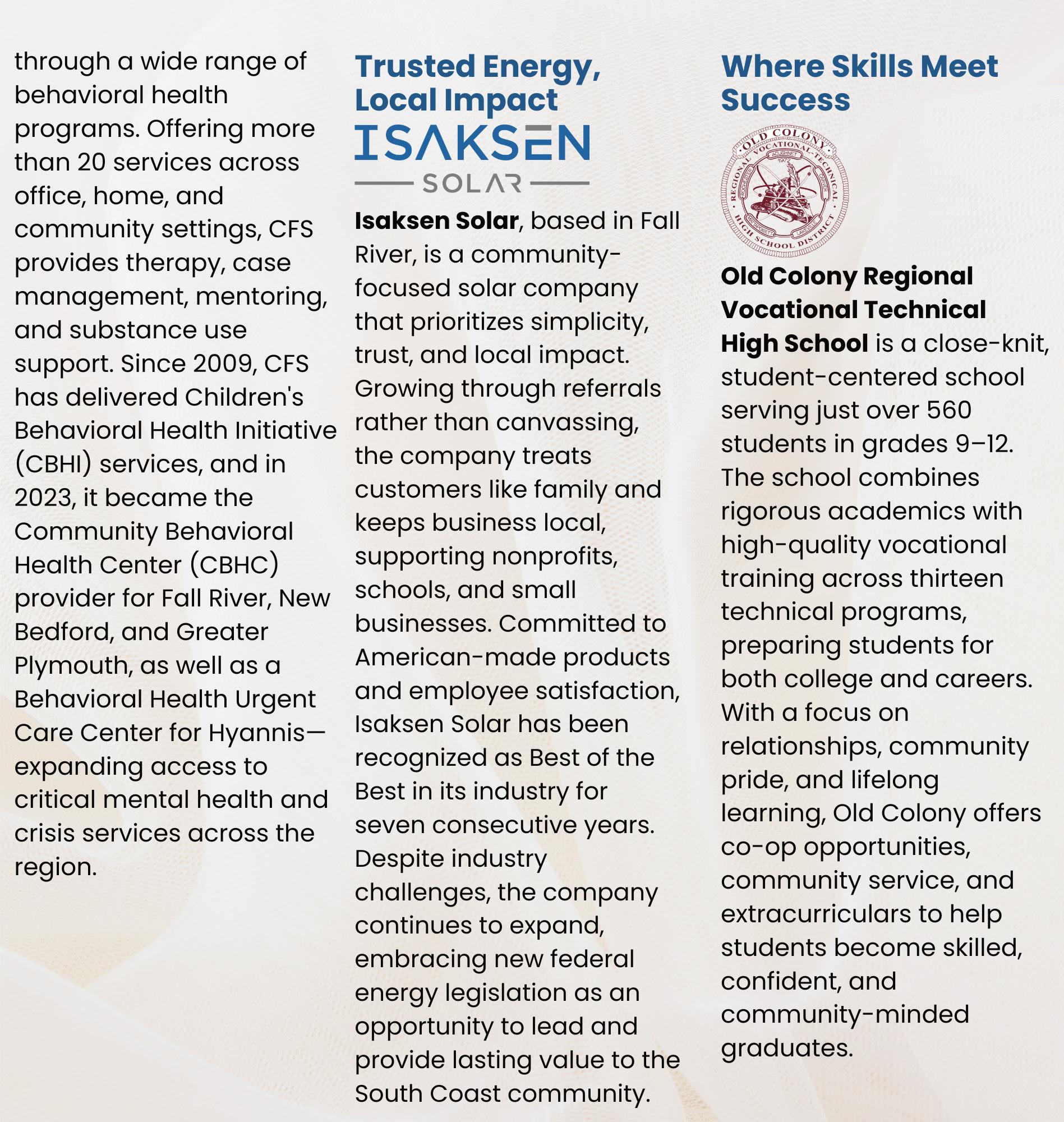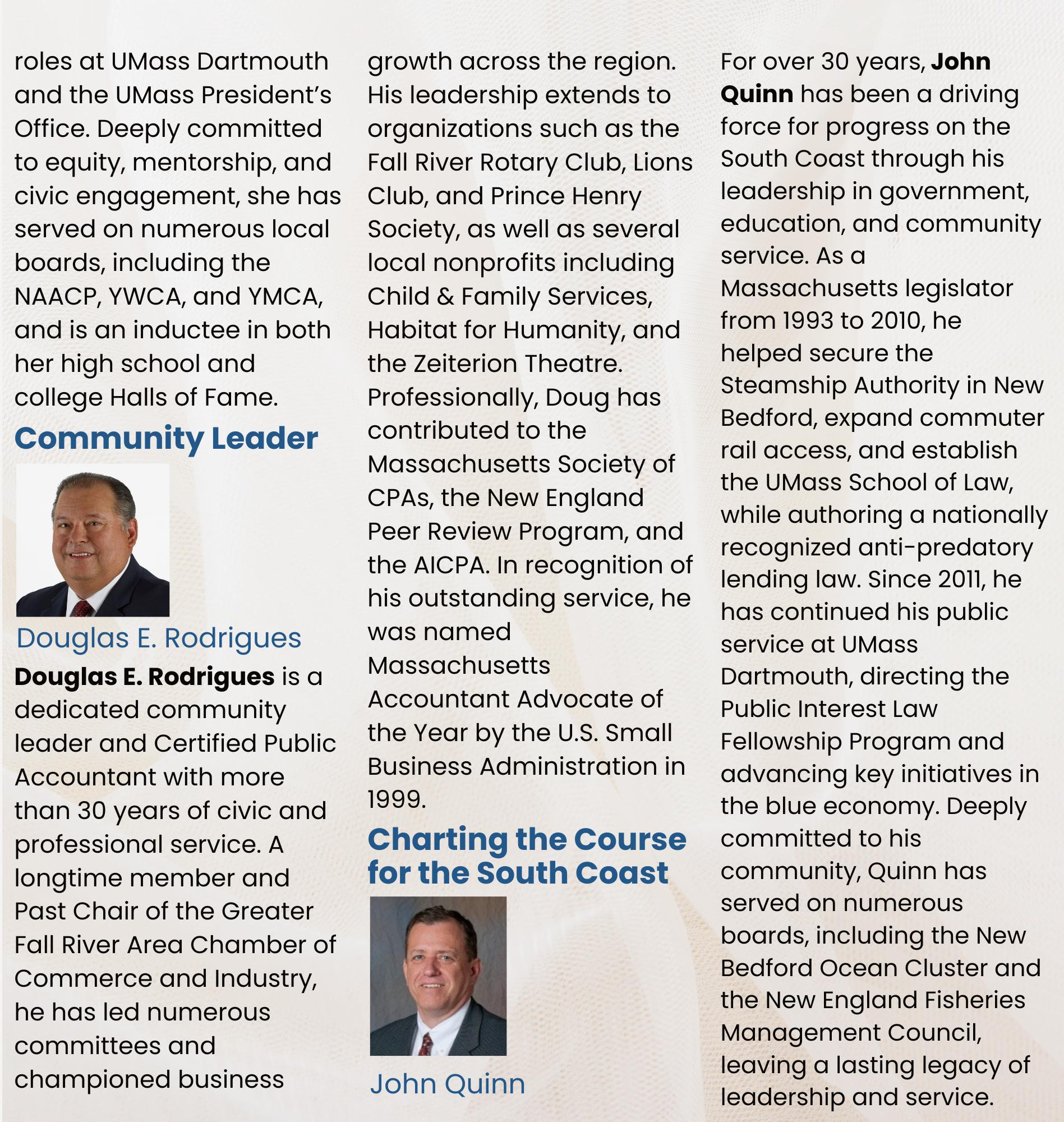 For over 40 years, Tom Menchi has been a committed South Coast resident and community leader, championing local business growth, workforce development, and philanthropy. As Vice President of Fixed Operations and Community Relations at Toyota of Dartmouth, he oversees multiple departments and builds strong community partnerships. A dedicated One SouthCoast Chamber Ambassador, Tom connects businesses and supports regional economic initiatives. His leadership has helped Toyota of Dartmouth sponsor programs such as Junior for Achievement, the BCC Earth Day Fair, and the Boy Scouts of Westport, while his volunteer work with local vocational schools helps prepare students technical careers. Recognized with the 2018 Community Service Award, Tom continues to strengthen the South Coast through mentorship, advocacy, and service.