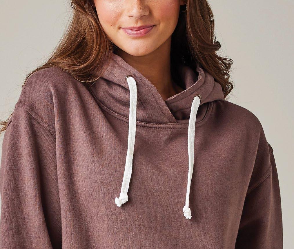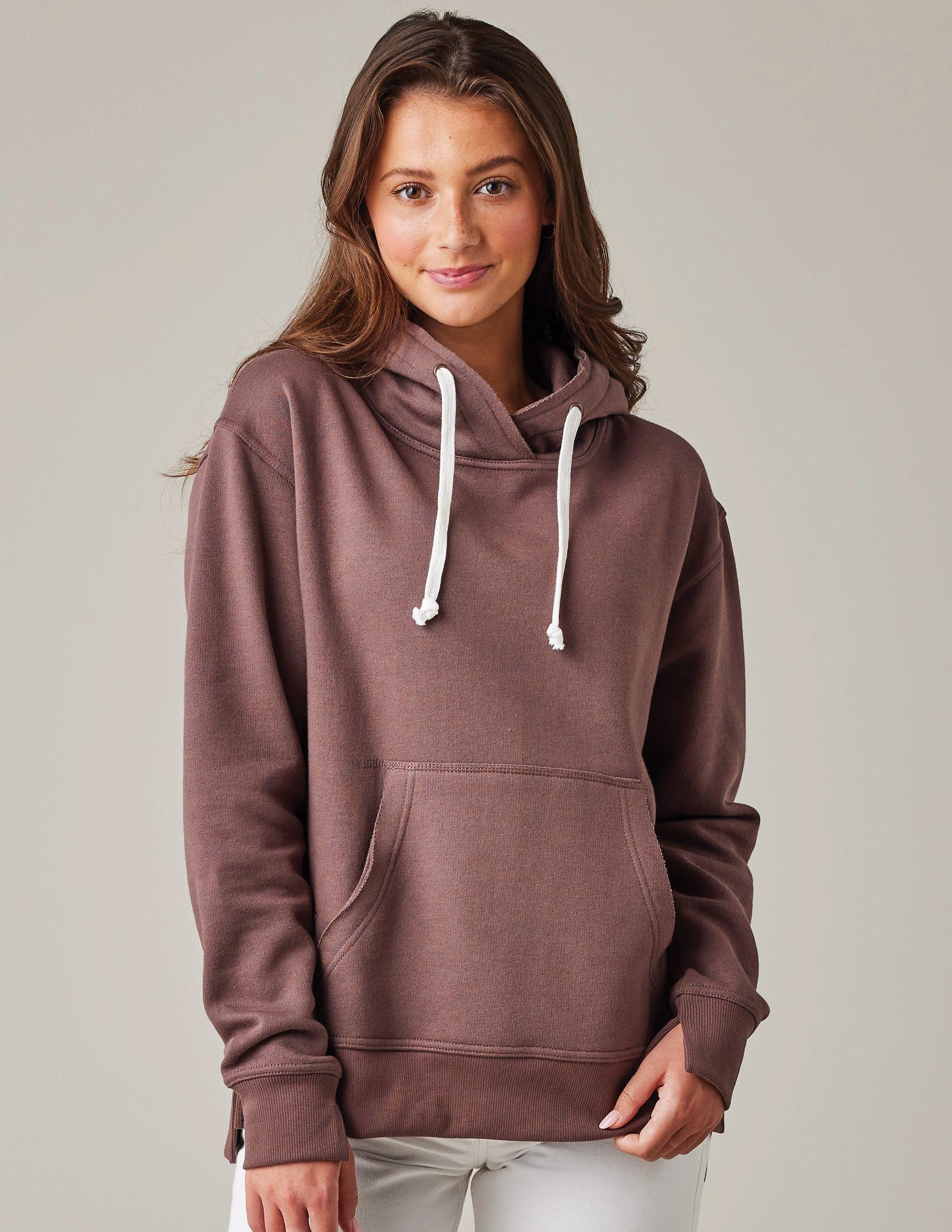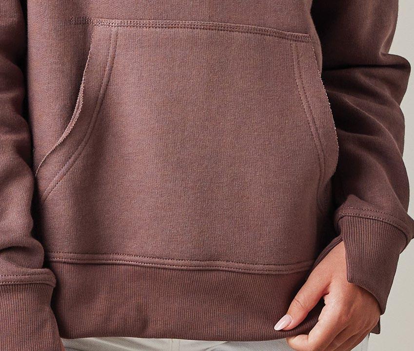 Tear away label. Double lined fleece hood. Interior twill tape at hood. Raw edge hood with single needle stitch. Extended crossover hood neckline. Twill tape drawstring. Set-in sleeve. Rib cuff + sweep. Front pouch pocket with raw edges and double needle stitch. Extended back drop sweep with side slits. Relaxed silhouette.