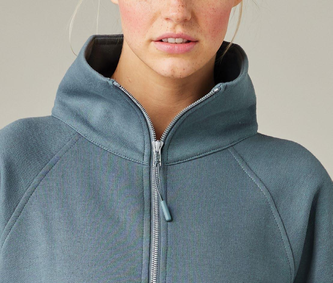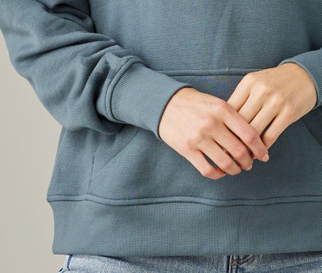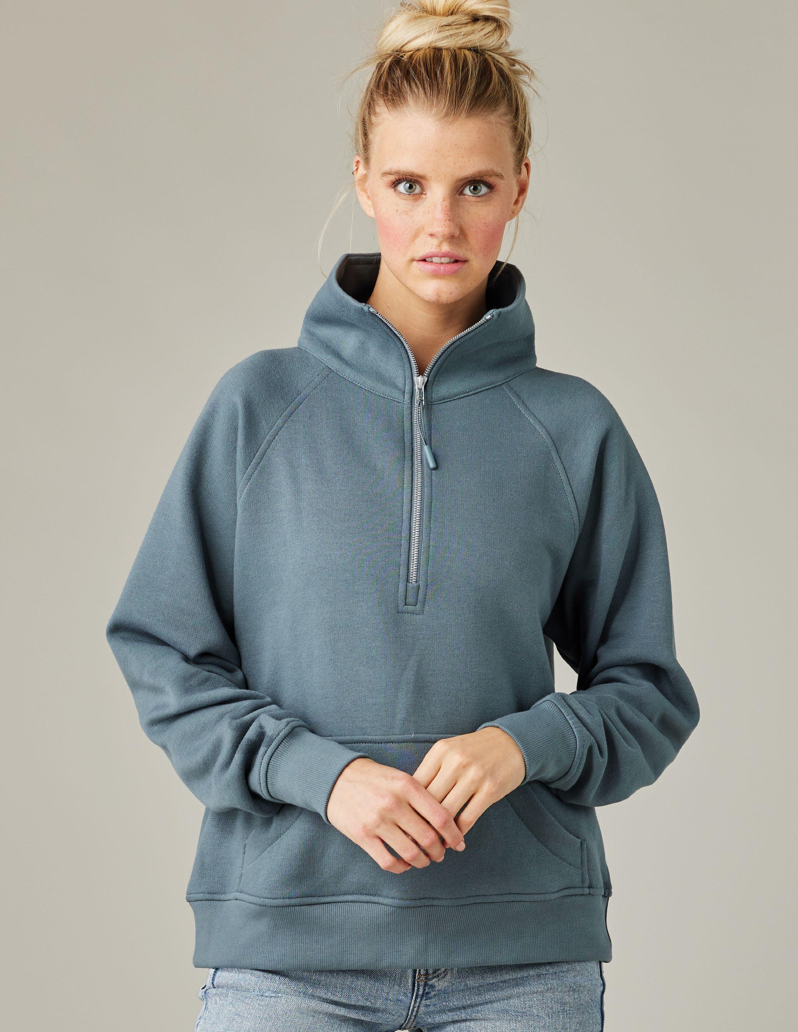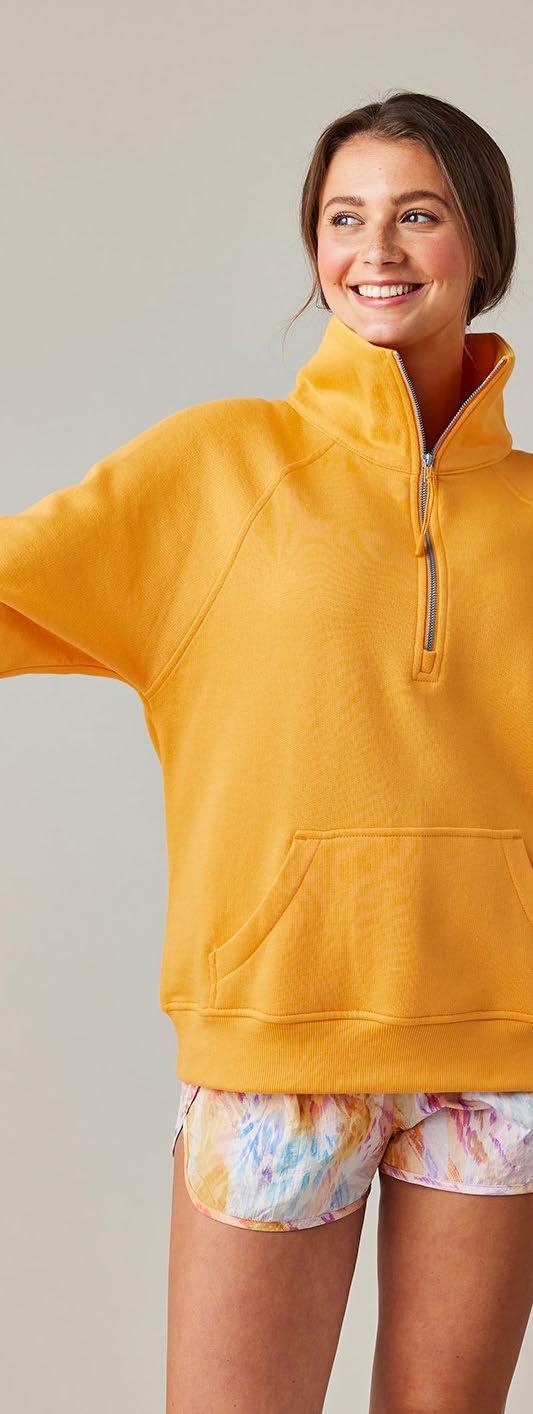 Tear away label. Half zip extended cadet collar neckline with stylish zipper pull. Raglan sleeves. Front pouch pocket. Rib cuff + sweep. Relaxed silhouette with boxy fit.