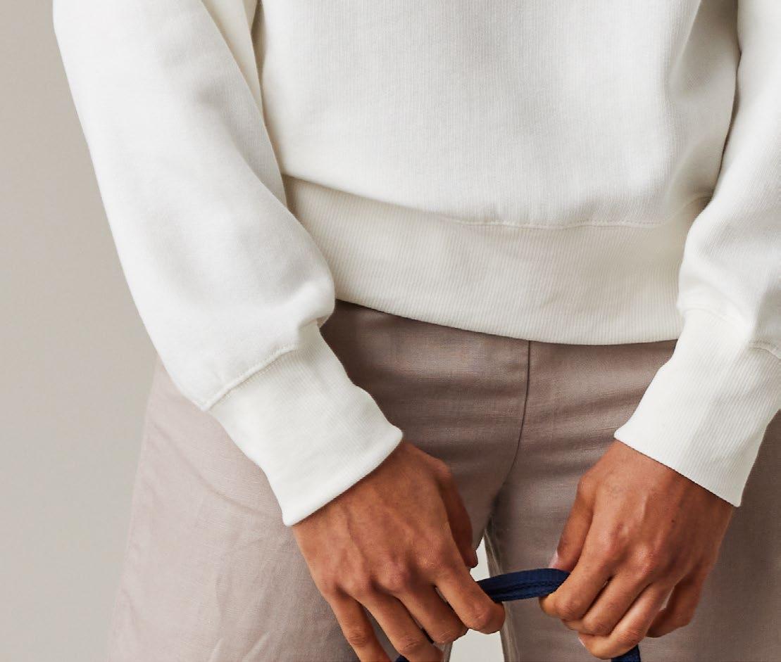 Tear away label. Drop shoulder set in sleeve. 2x2 rib at neckline, cuff, and sweep band. Inside back neck twill tape. Relaxed silhouette with boxy fit.