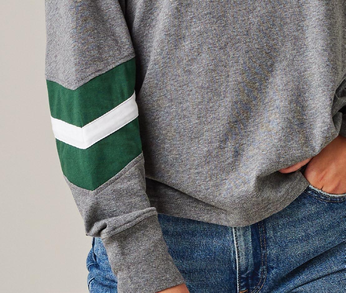 Tear away label. Drop shoulder, set in sleeve. Contrast diagonal self fabric stripes at sleeve. Rib trim at neckline and cuff. Open sweep bottom with side slits. Inside back neck twill tape. Relaxed silhouette with boxy fit. Wca-workplace conditions assessment & gsv- global security verifications certified.