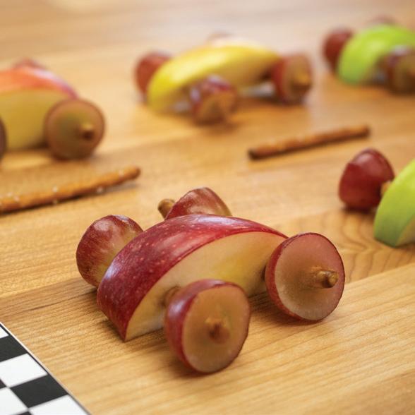 Consejo: Utiliza pretzels salados o tiras de mozzarella adicionales para crear ¡una carretera por la que viajan los coches de carrera!